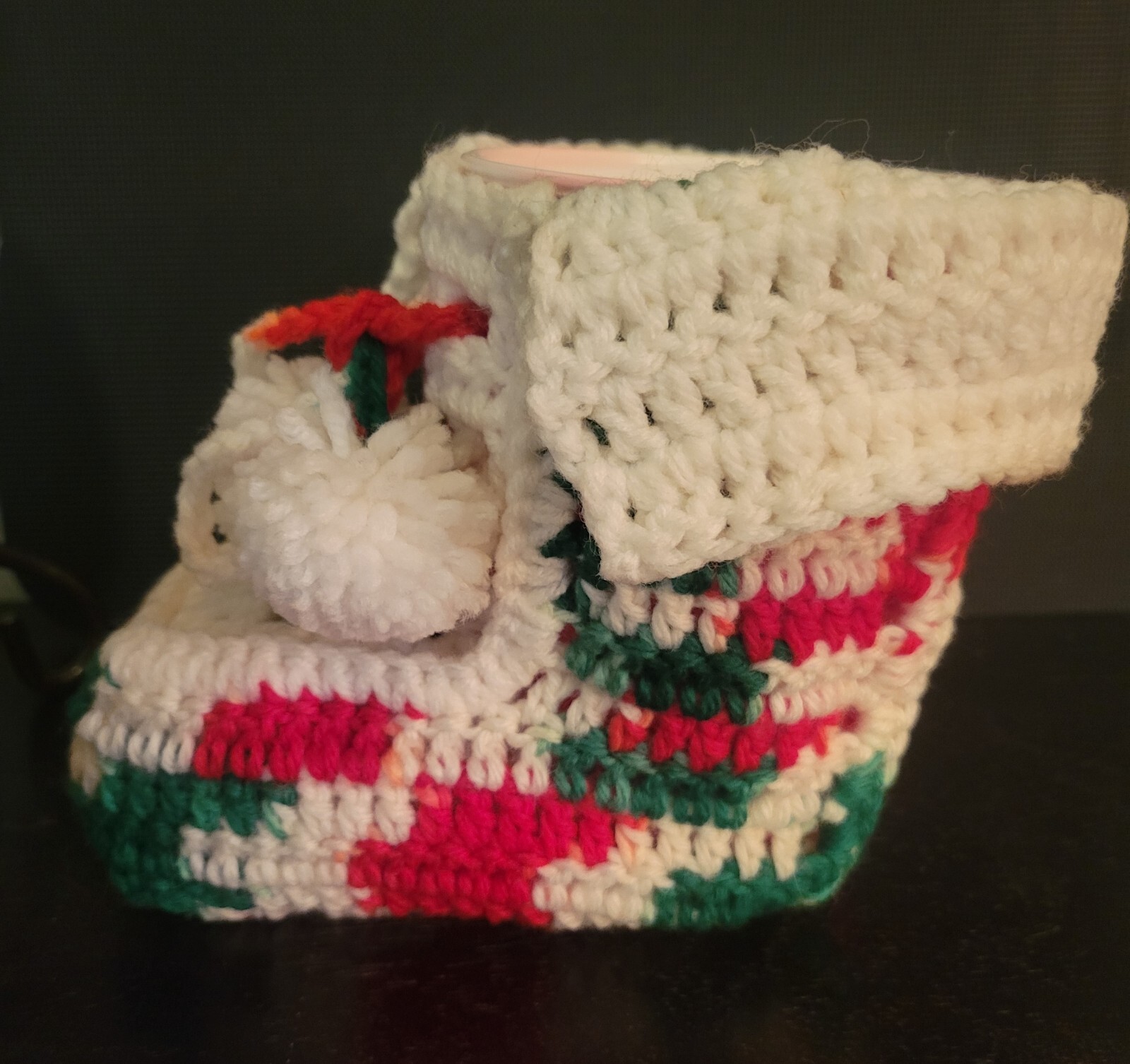 • Vintage Handmade Crocheted Pom Pom Tie Christmas Bootie