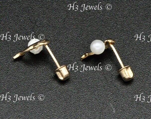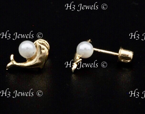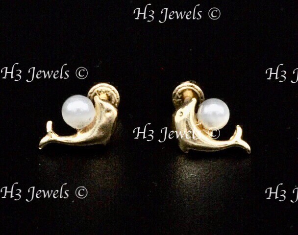 14k Solid Yellow gold kids Stud Dolphin earring earrings Pearl Screw back 13904