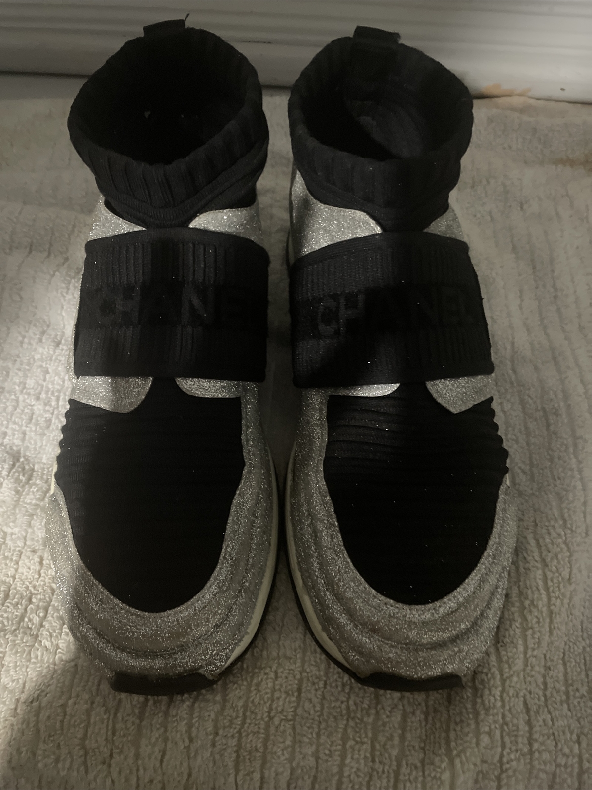 как выглядит CHANEL Glitter Stretch Fabric CC Sock Sneakers size 38 фото