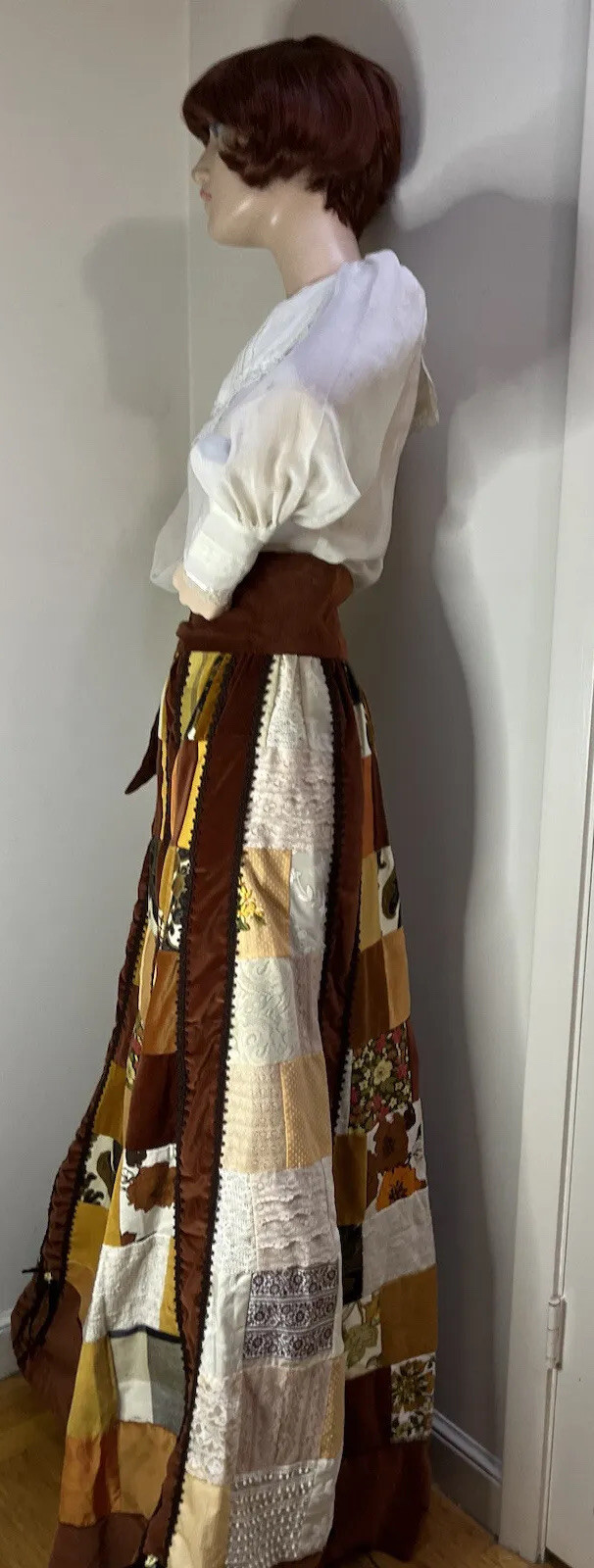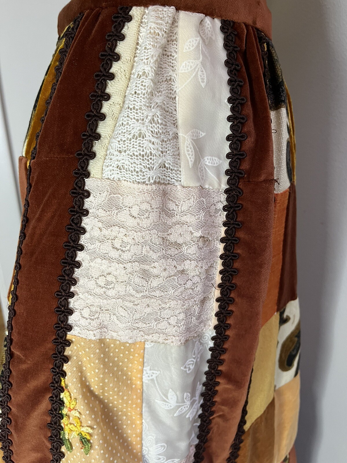 как выглядит Vtg Skirt Patchwork 70s Long Skirt Brown Maxi Velvet Flower Hippy 26 Waist фото