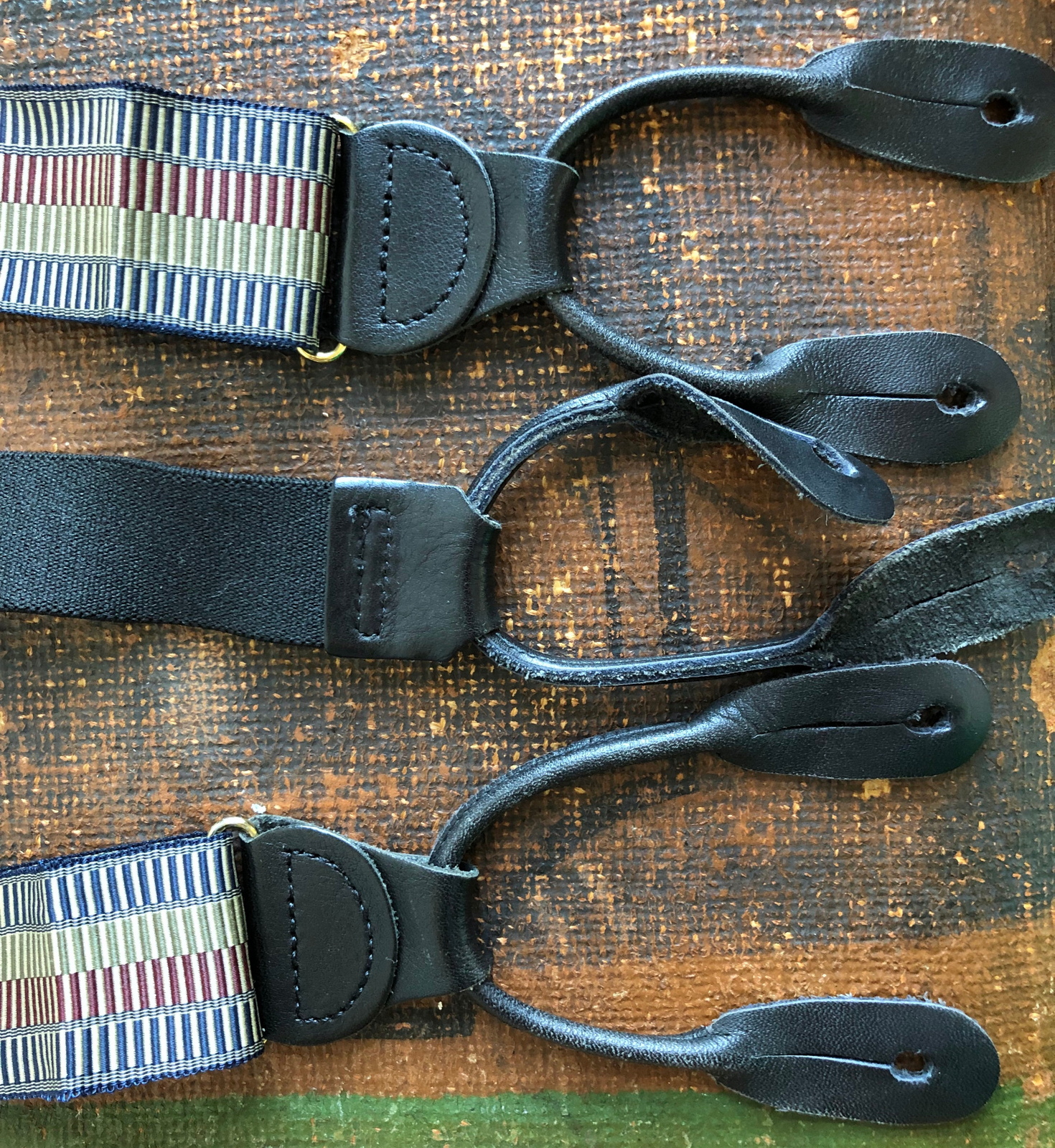 как выглядит VTG WOVEN TEXTURED SUSPENDERS BRACES BLUE MAROON GREEN BLACK LEATHER ENGLAND EUC фото