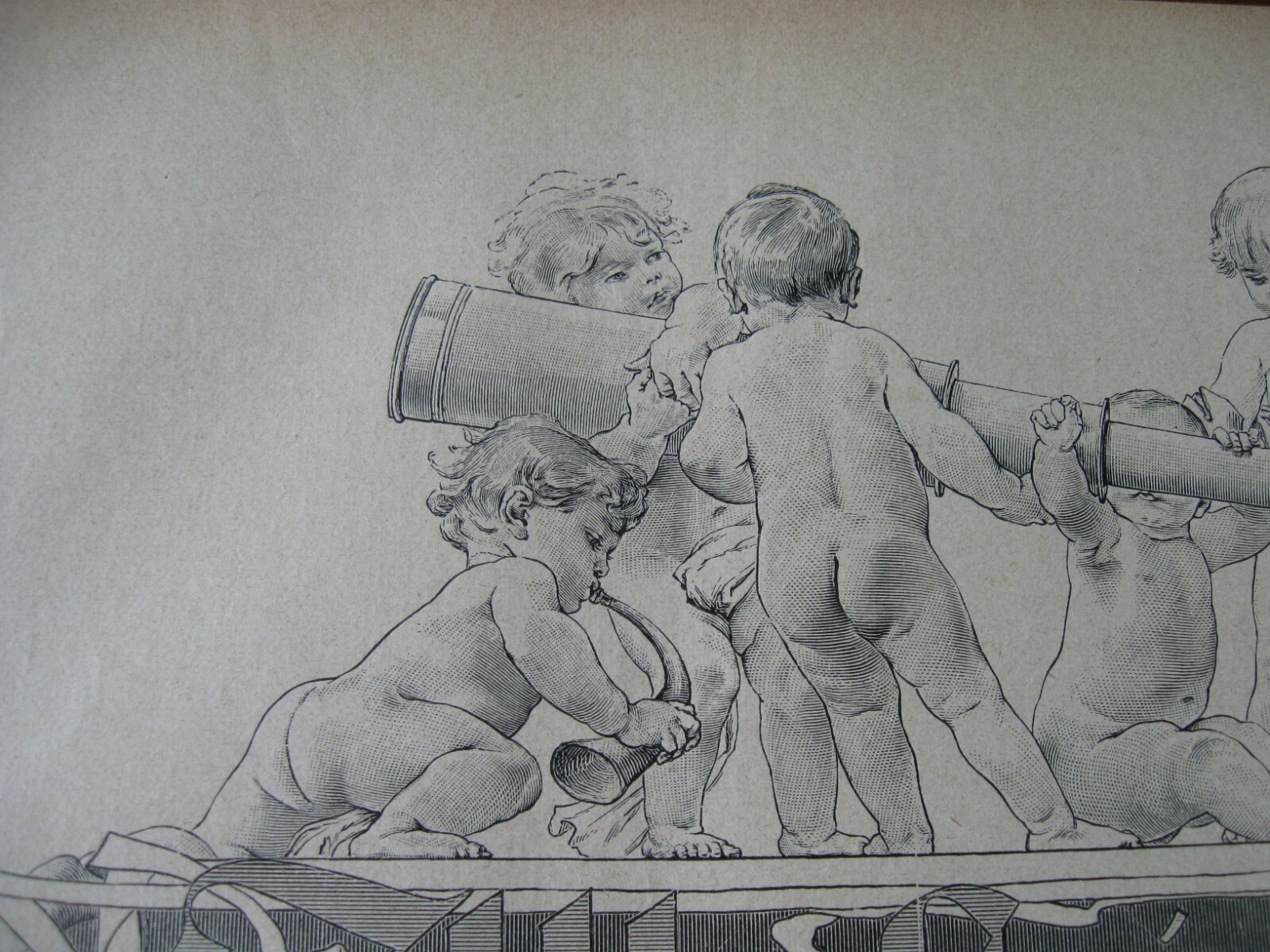 как выглядит 1898 Vignette Art Print - Nude BABY BABIES Playing w TELESCOPE Astronomy SKY See фото
