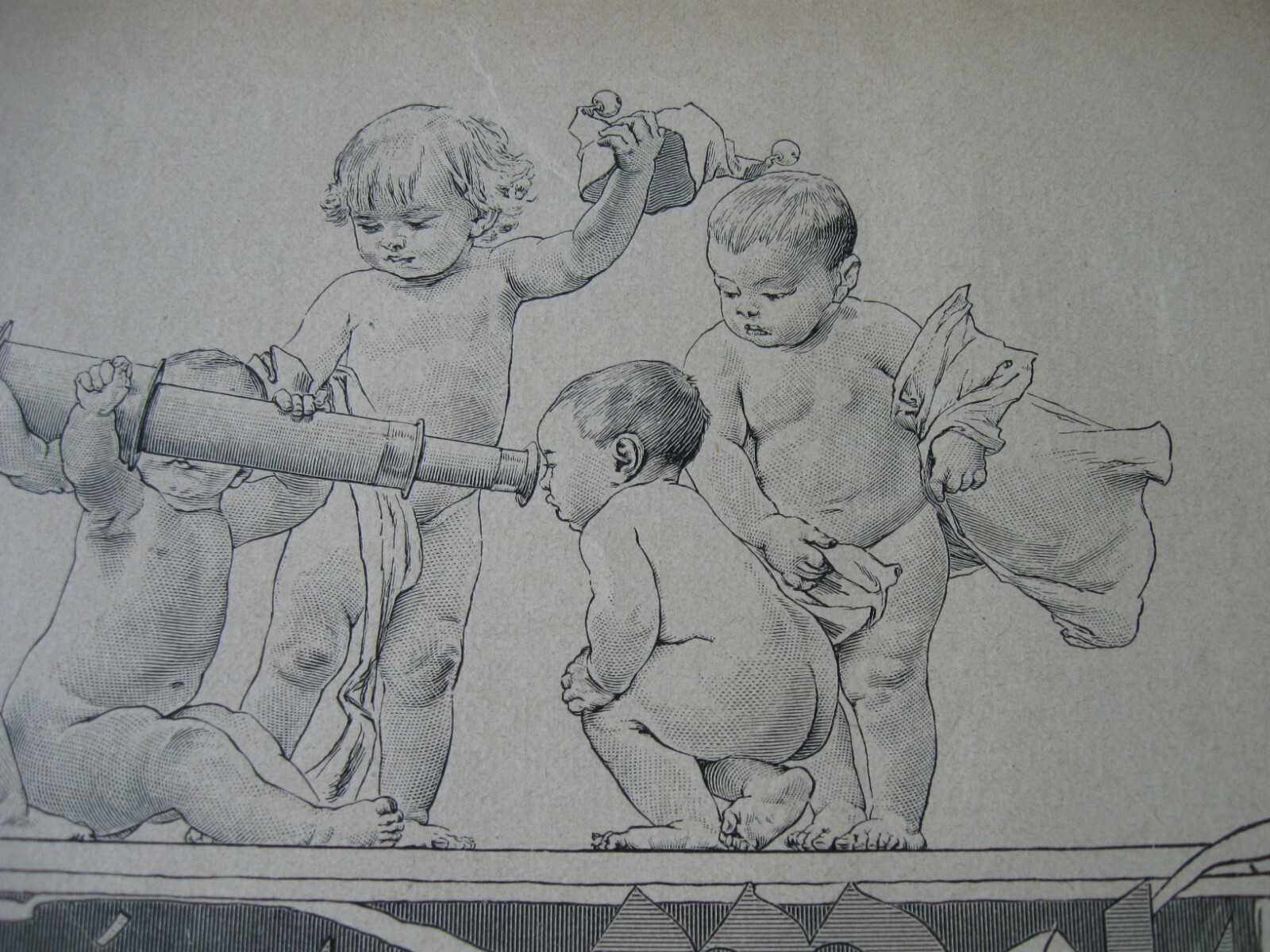 1898 Vignette Art Print - Nude BABY BABIES Playing w TELESCOPE Astronomy SKY See