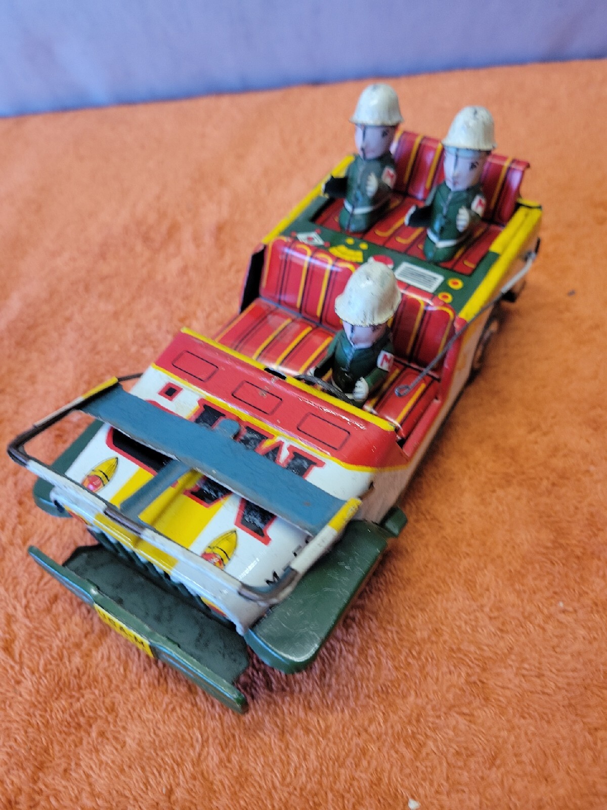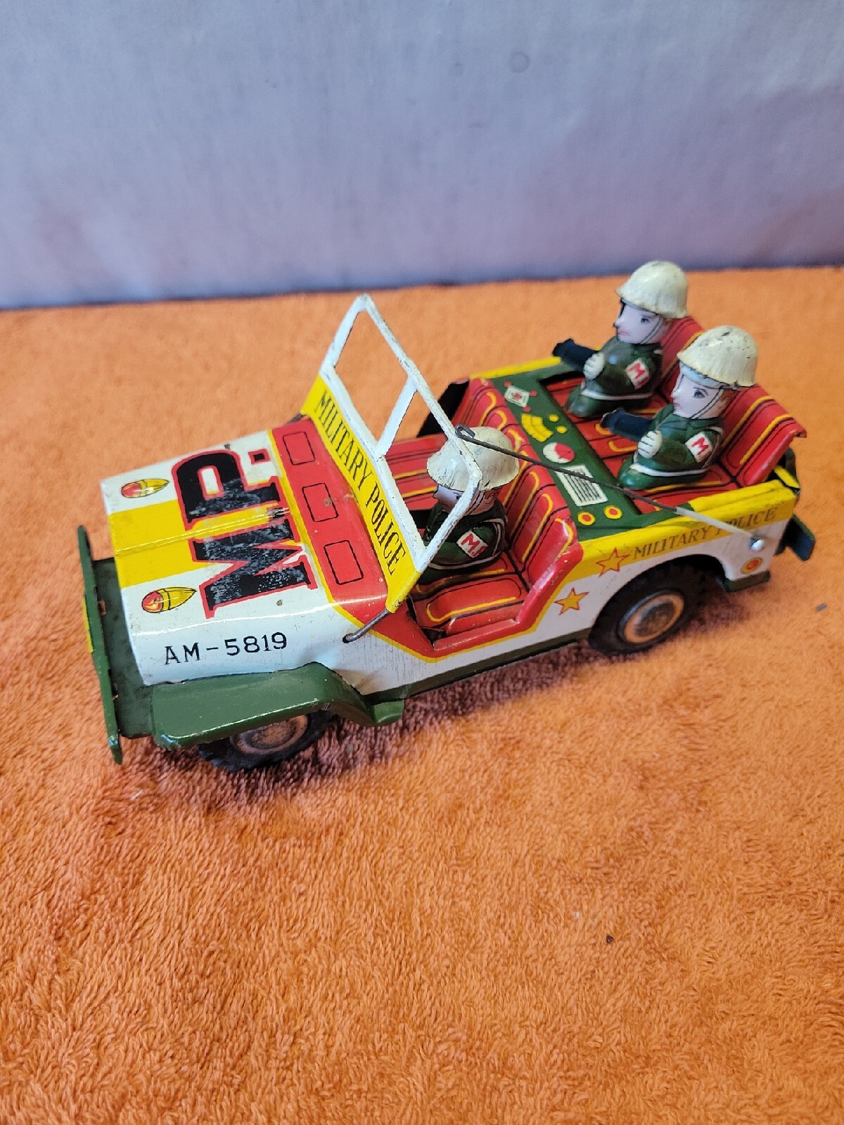 U Vintage M.P. Military Police Tin Litho Jeep AM-5819 working Friction Car.