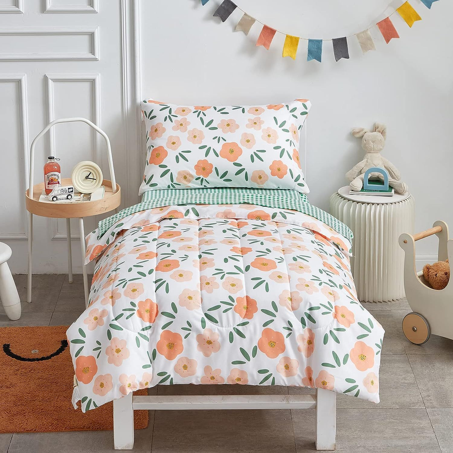 4 Pieces White Girls Toddler Bedding Set Orange Floral Style Colorful Flowers