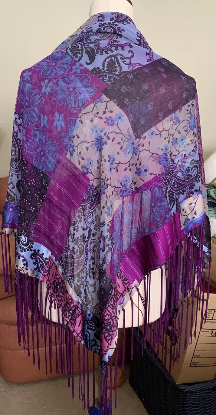 как выглядит Vintage Elaine Gold for Collection XIIX Purple Patchwork Fringed Sheer Art Scarf фото
