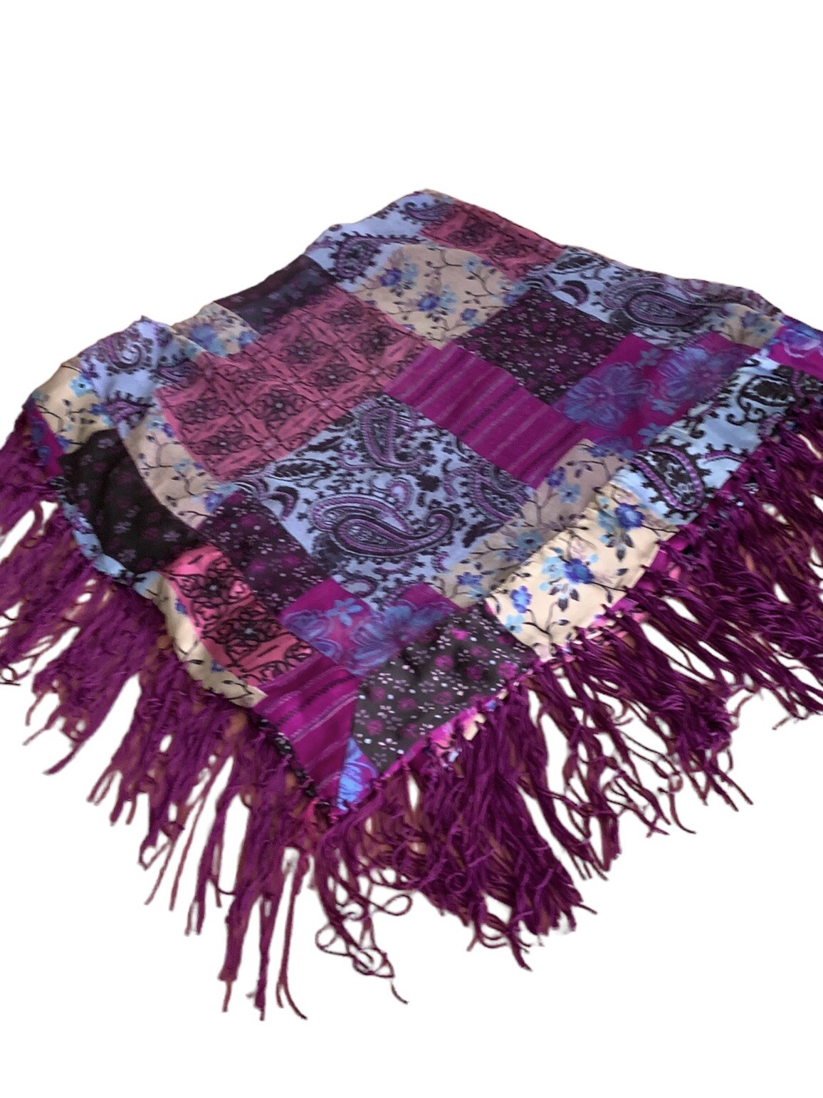 Vintage Elaine Gold for Collection XIIX Purple Patchwork Fringed Sheer Art Scarf