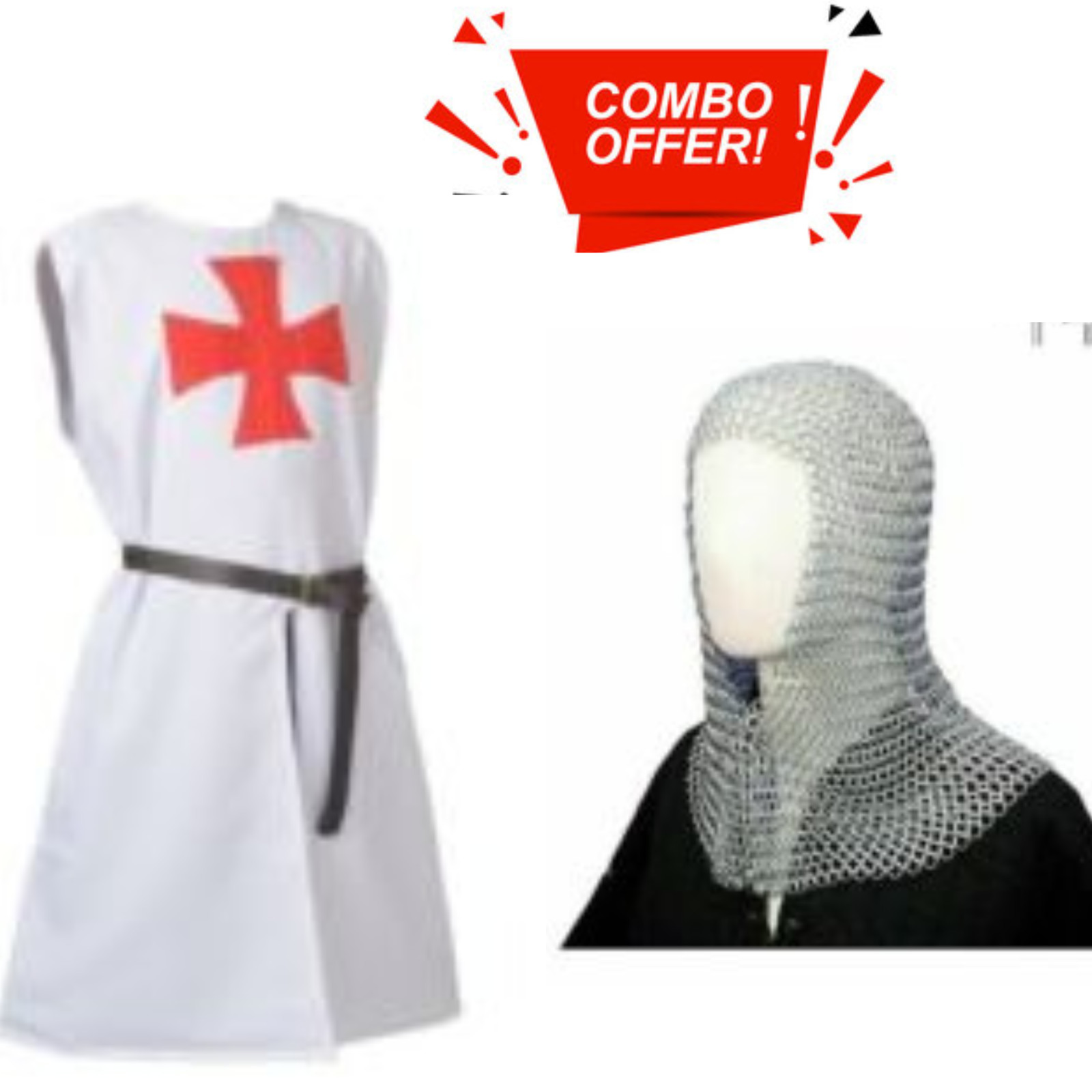 Combo Pack Chain mail Coif and Cotton Fabrics Templar Cross Tunic wear New