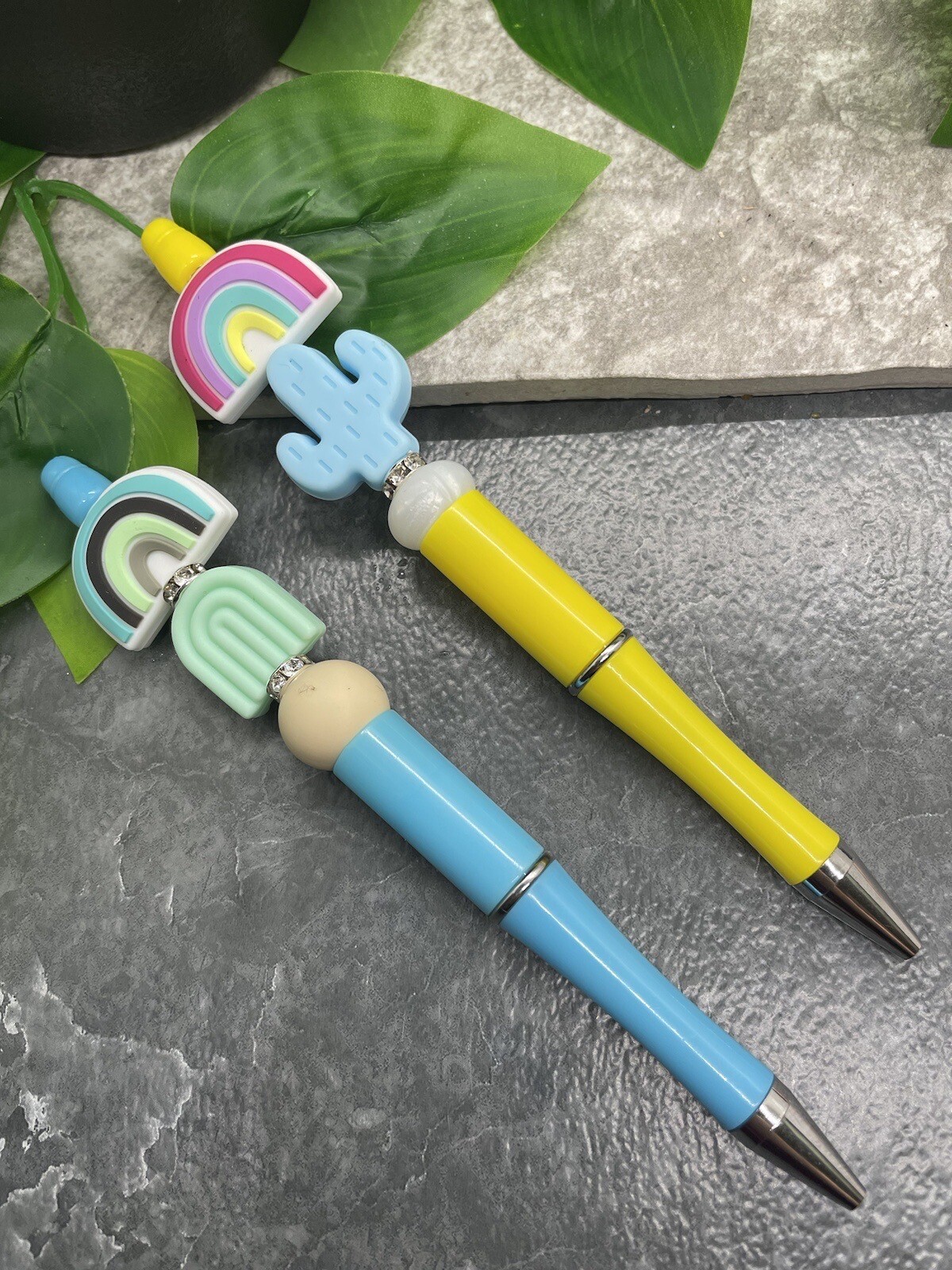 2 PC Handmade Silicone Bead Rhinestone Black Ink Pen Set New Rainbow A3767