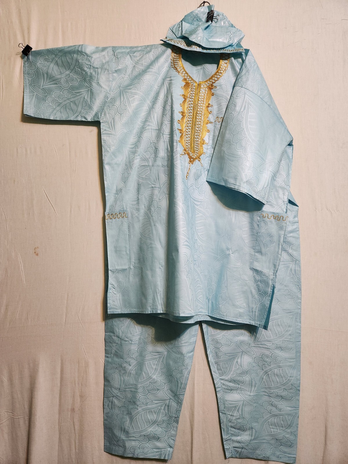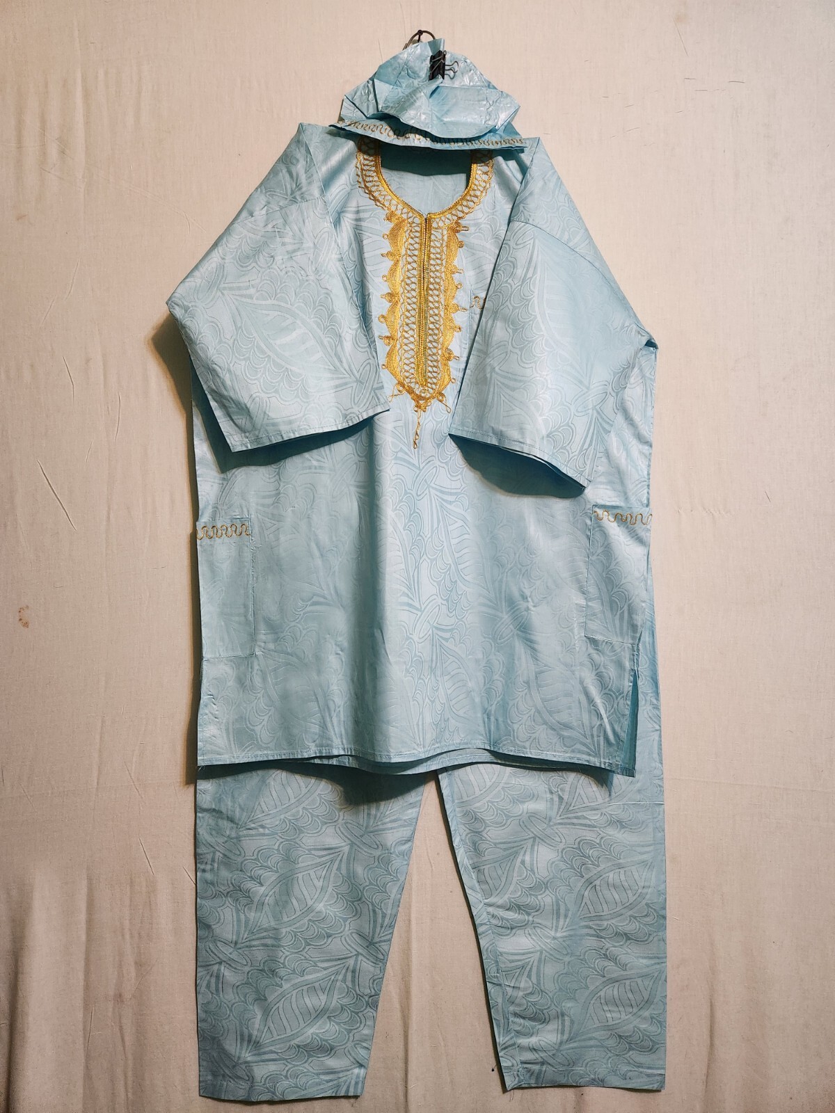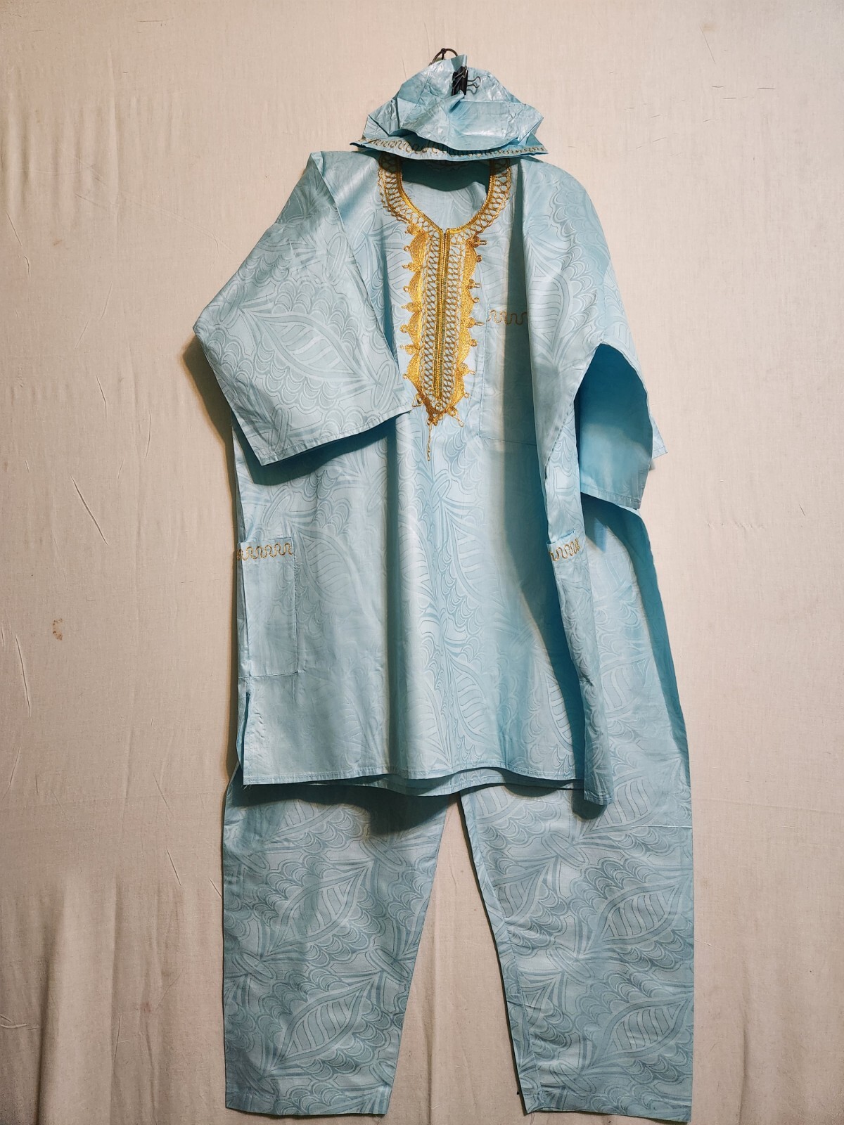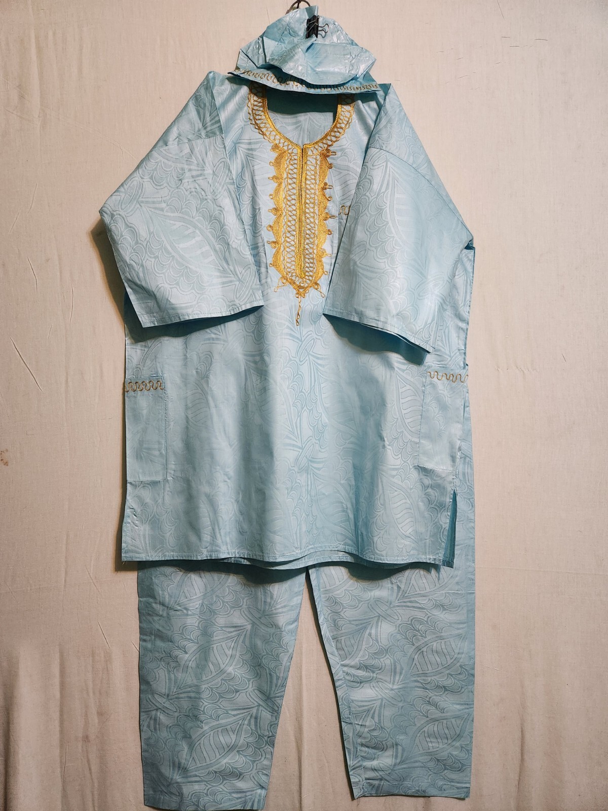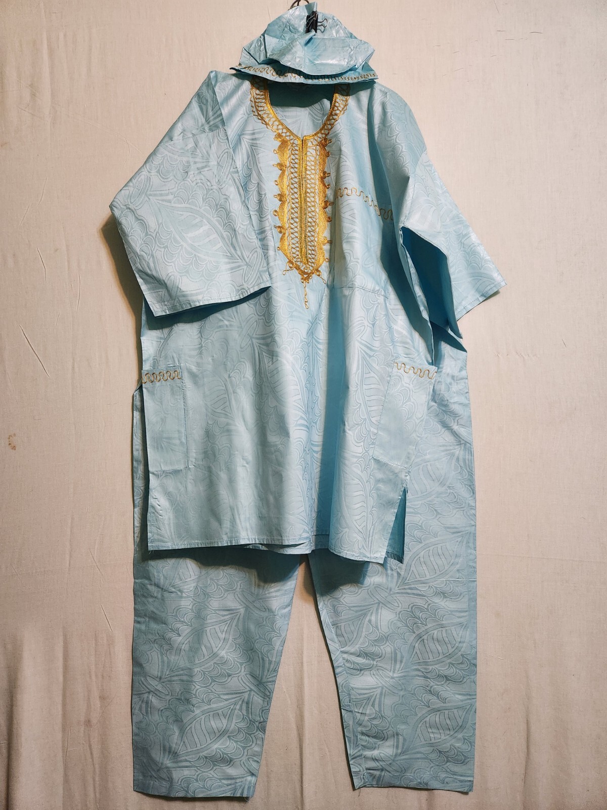как выглядит African Clothing Men Brocade 3Pcs Pant Suit Dashiki with Cap Sea Blue Free Size фото