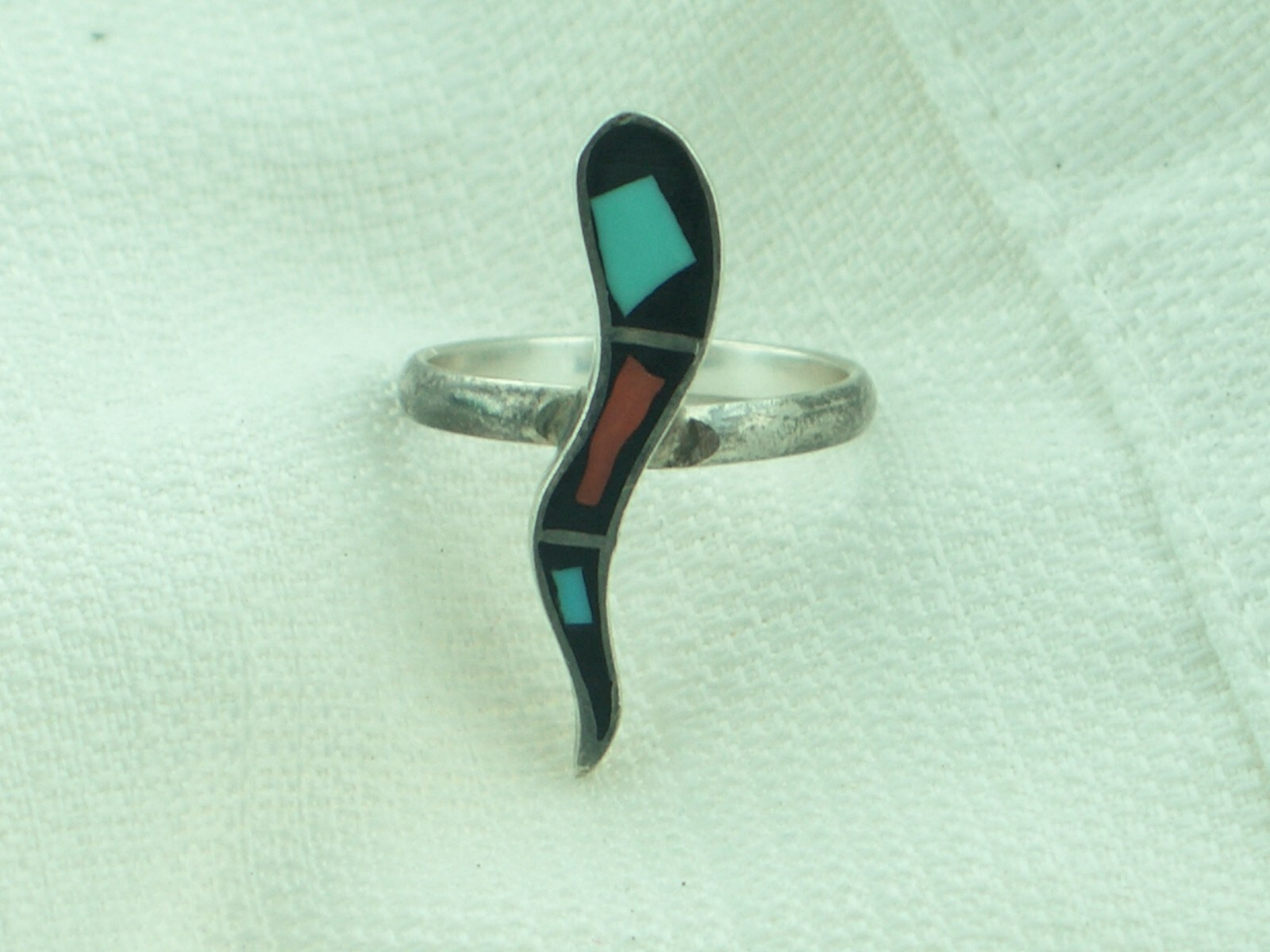 Sterling Silver Ring Inlaid Turquoise Coral Onyx Snake EX