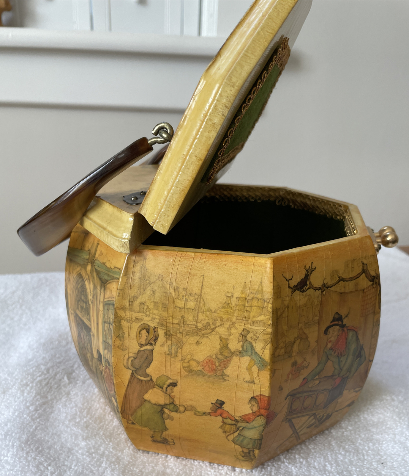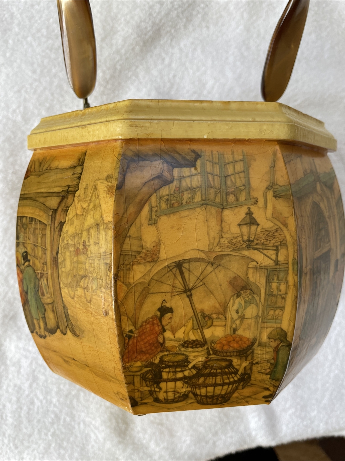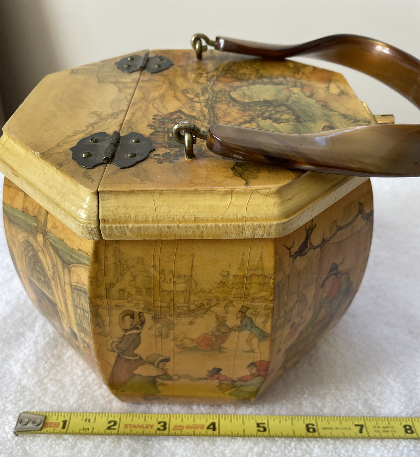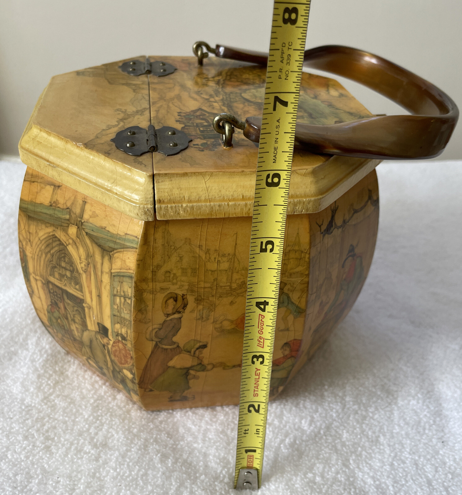 Vintage Anton Pieck Town Scene Octagonal Purse / Notions Box With Lucite Handle