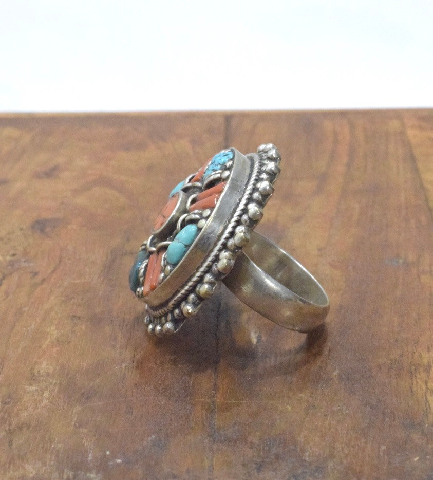 Tibetan Silver Turquoise Coral Ring