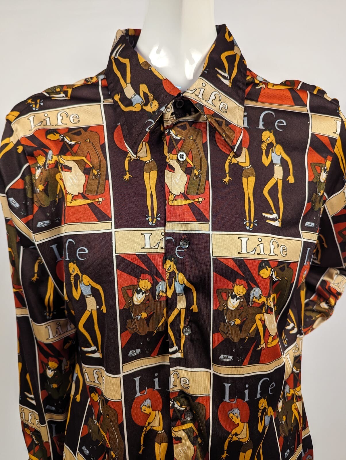 как выглядит ART DECO FIGURAL LIFE NOVELTY PRINT VINTAGE 1970 S NYLON SHIRT TOP фото