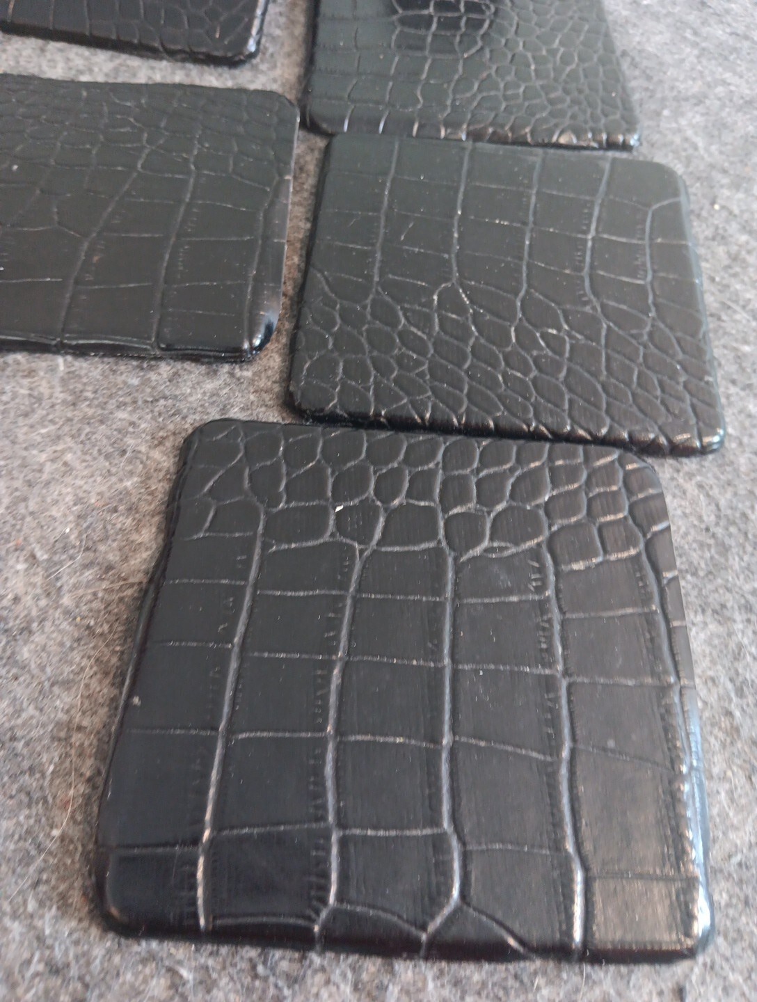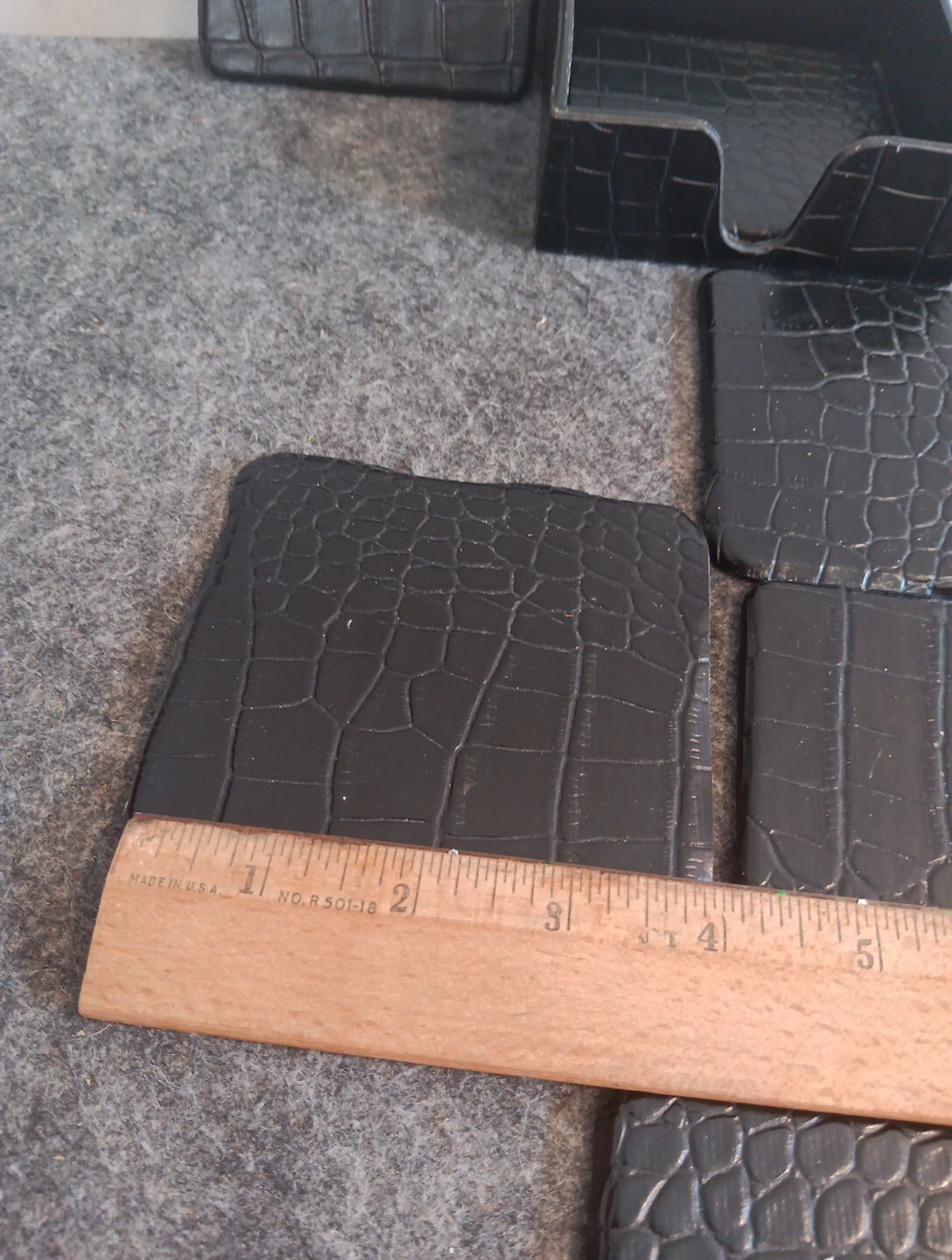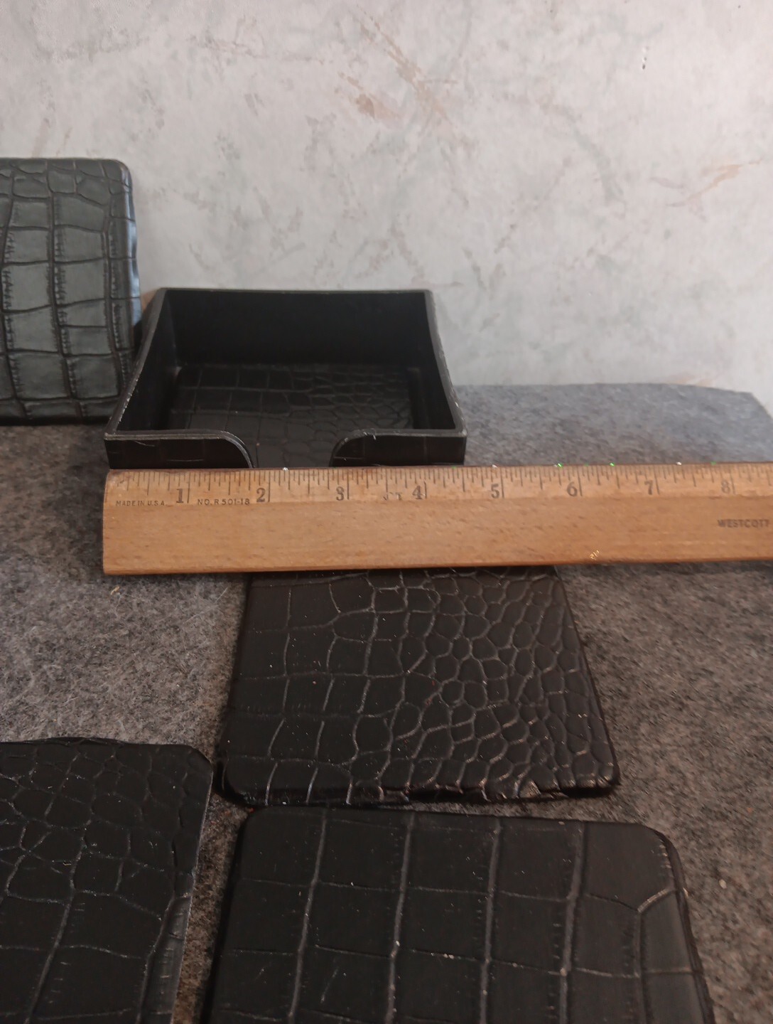 как выглядит Vintage Black Leather Coaster Set - 6 Squares With Holder. Felt Bottoms фото