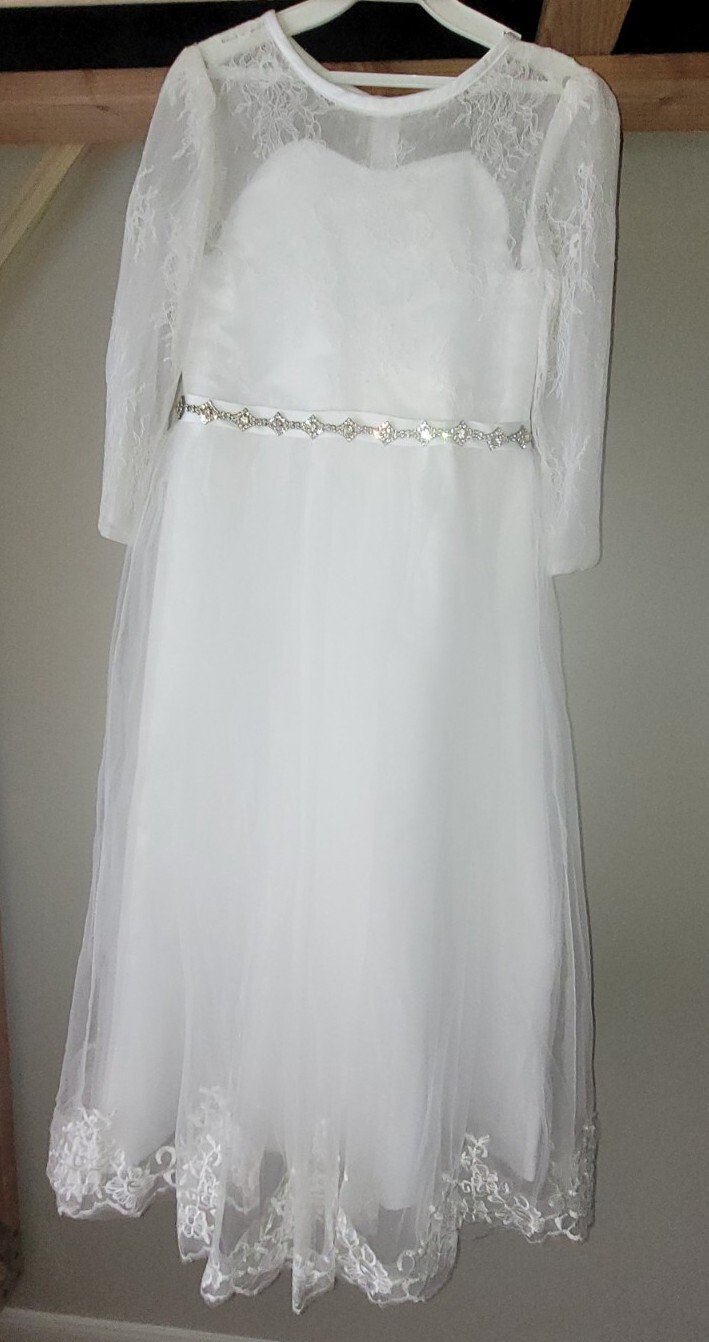 House White Floor-Length Tulle Flower Girl Dress Sz 12 Jeweled Waist