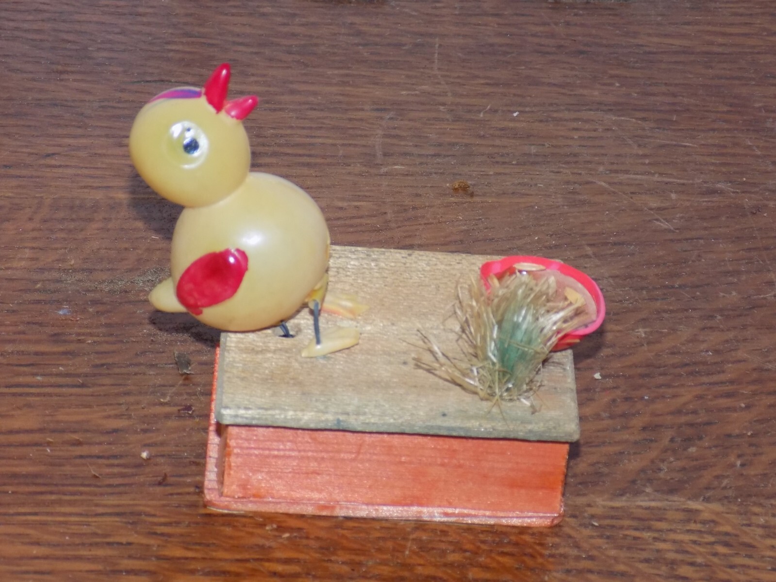 Vintage Celluloid Chicken Feeding in a Grain Basket Toy