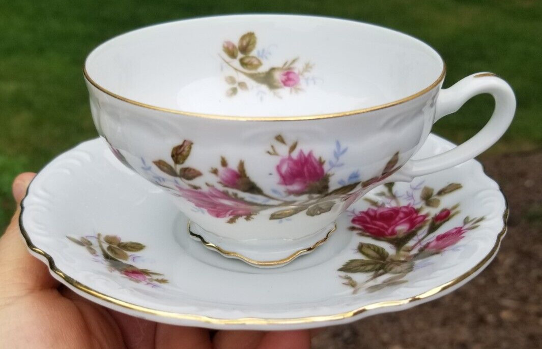 Tea Cup & Saucer Set, Royal Rose Fine China - Japan: 6 oz Capacity, White with Pink Roses Greenery Vintage Vtg