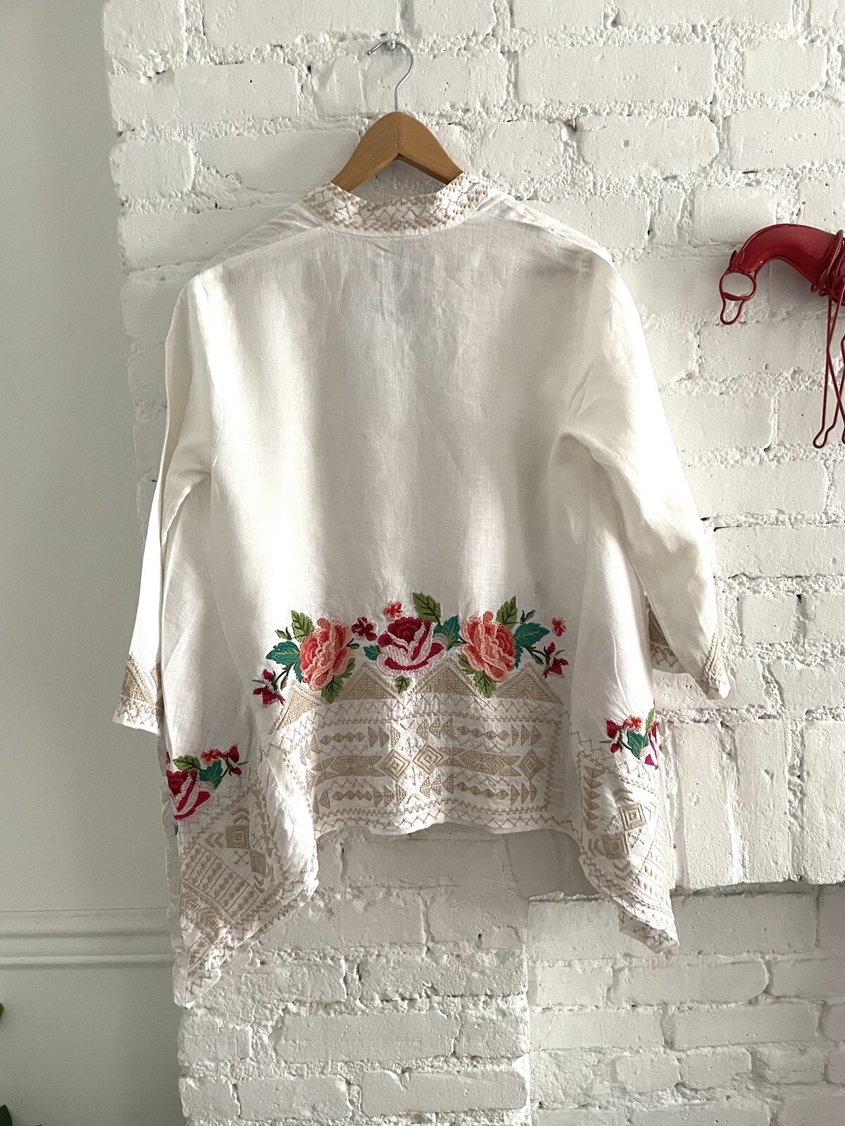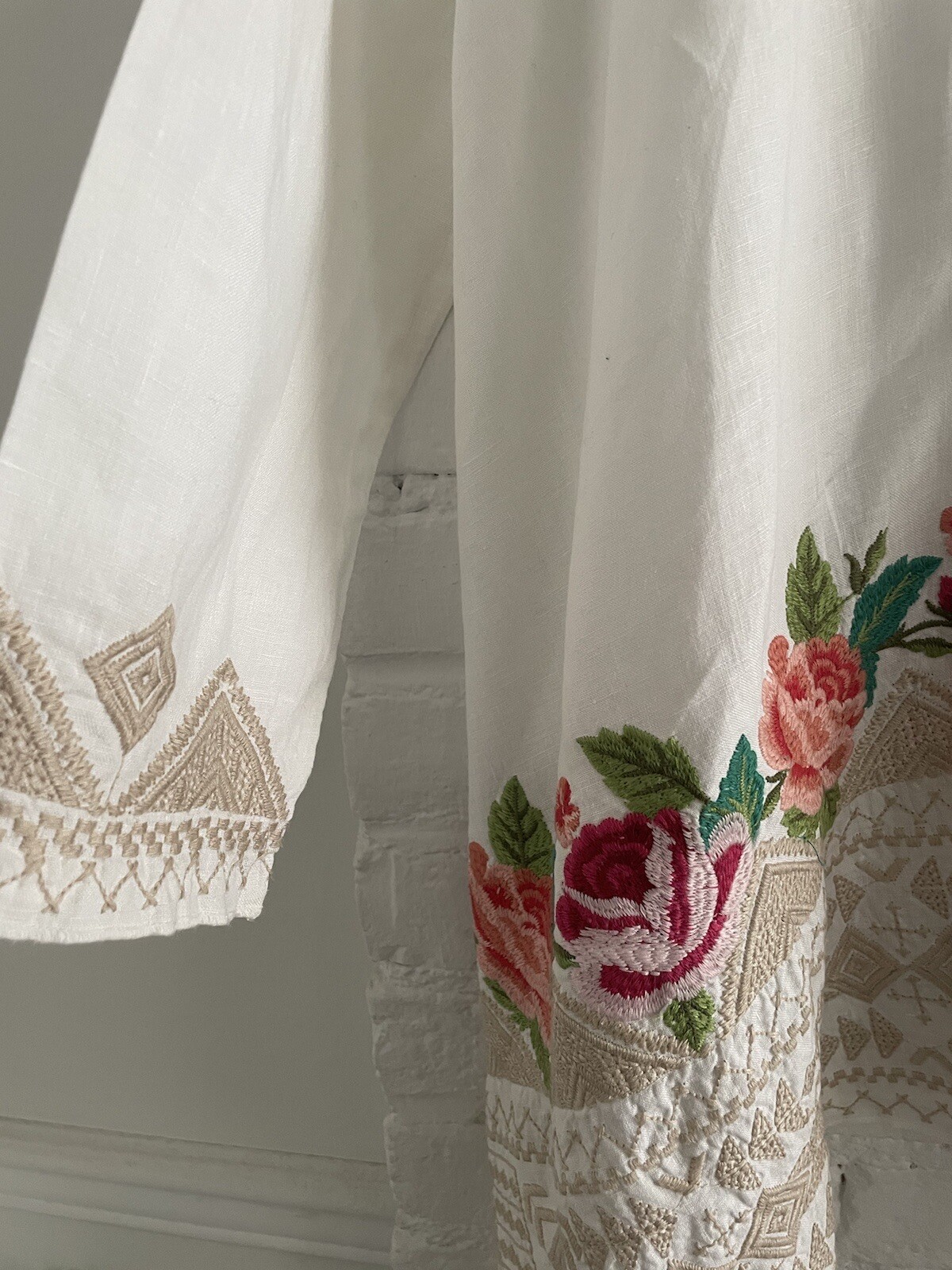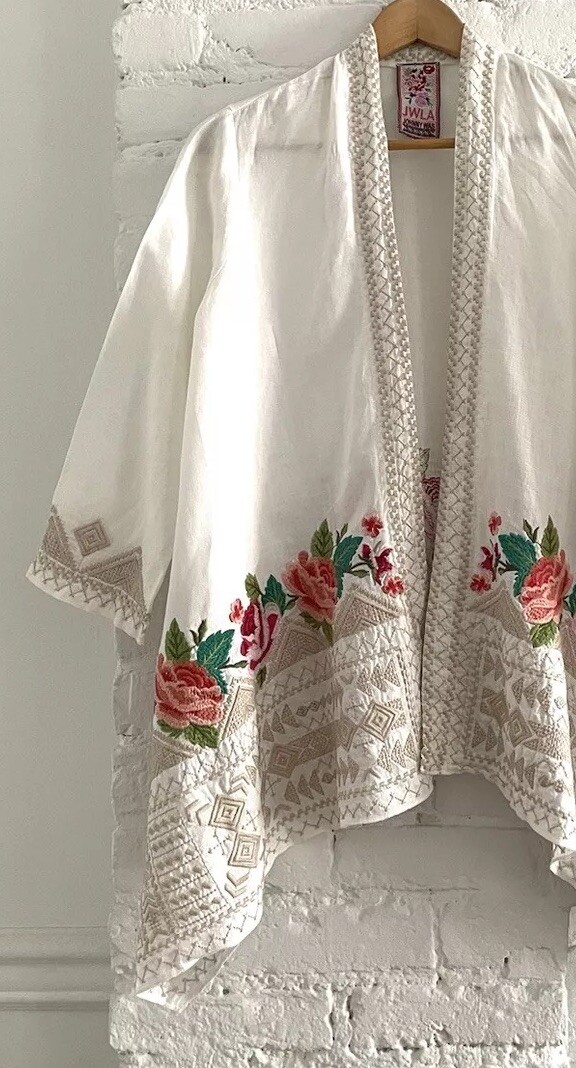 как выглядит Johnny Was Linen Embroidered Kimono Duster Jacket Fit S M White фото