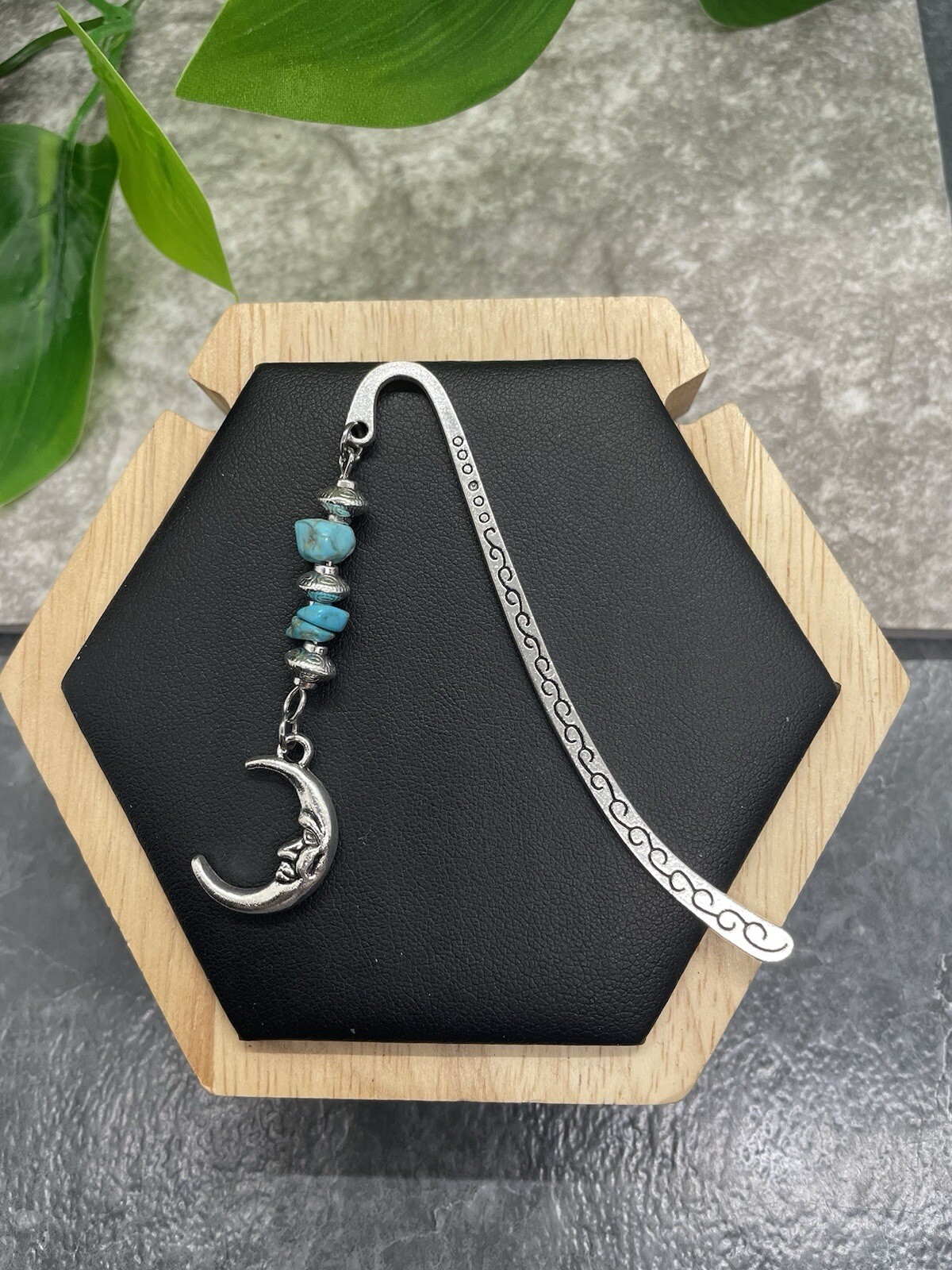 как выглядит 3.5" Handmade Silver-tone Etched Metal Hook Bookmark Beaded Charm Moon 20 фото