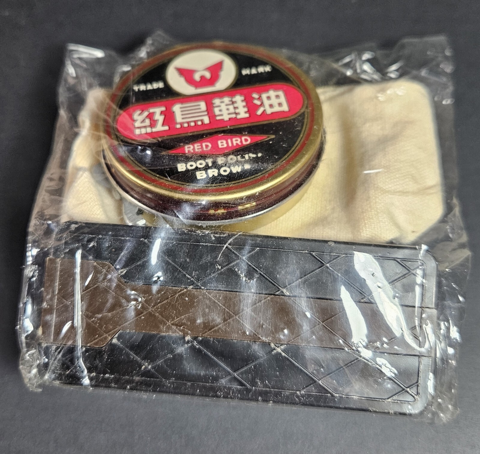 как выглядит Vintage Travel Shoe Shine Kit In Decorative Tin 5 Cent Shine Made In Hong Kong фото