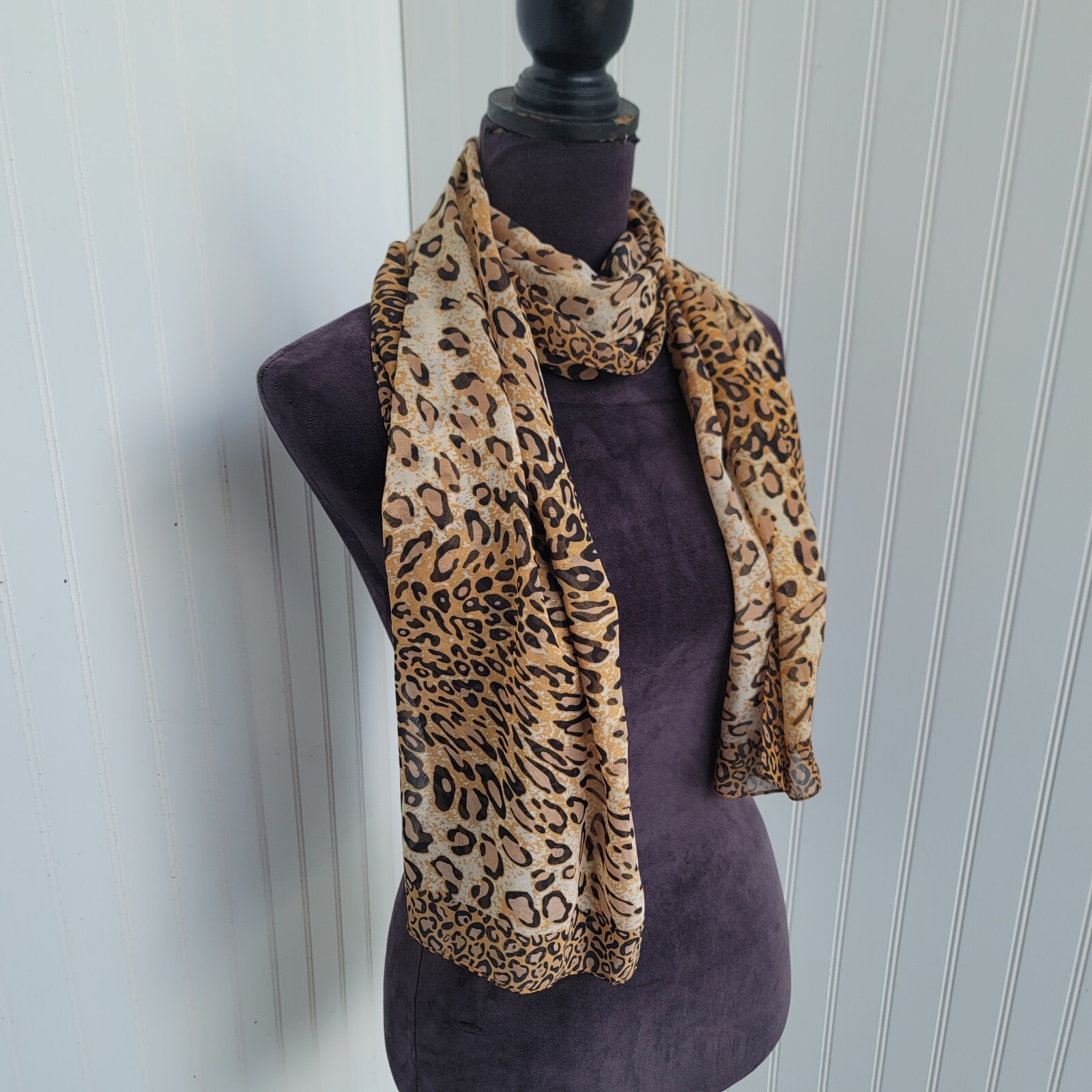 как выглядит Ladies Sheer Scarf Leopard Cheetah Print Brown Beige Tan - 20" x 60" фото