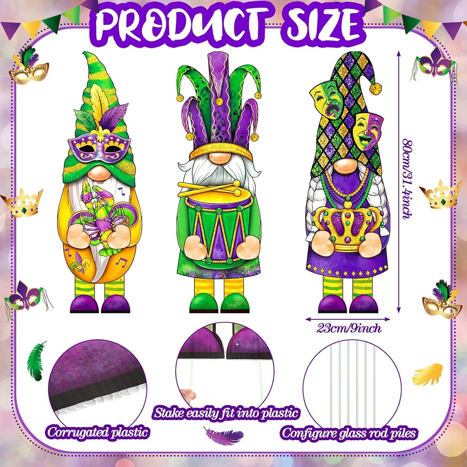 как выглядит 3 Pcs Mardi Gras Yard Sign Gnome Outdoor with Stakes Gold... фото