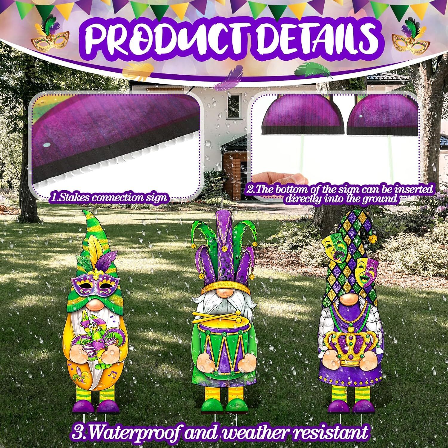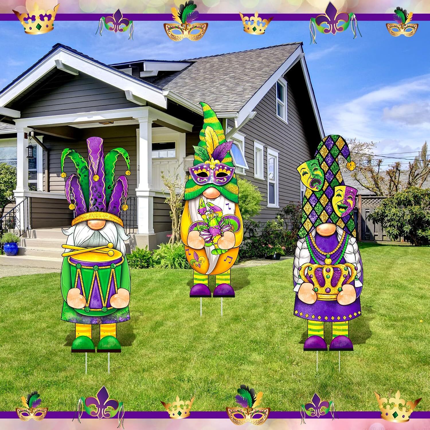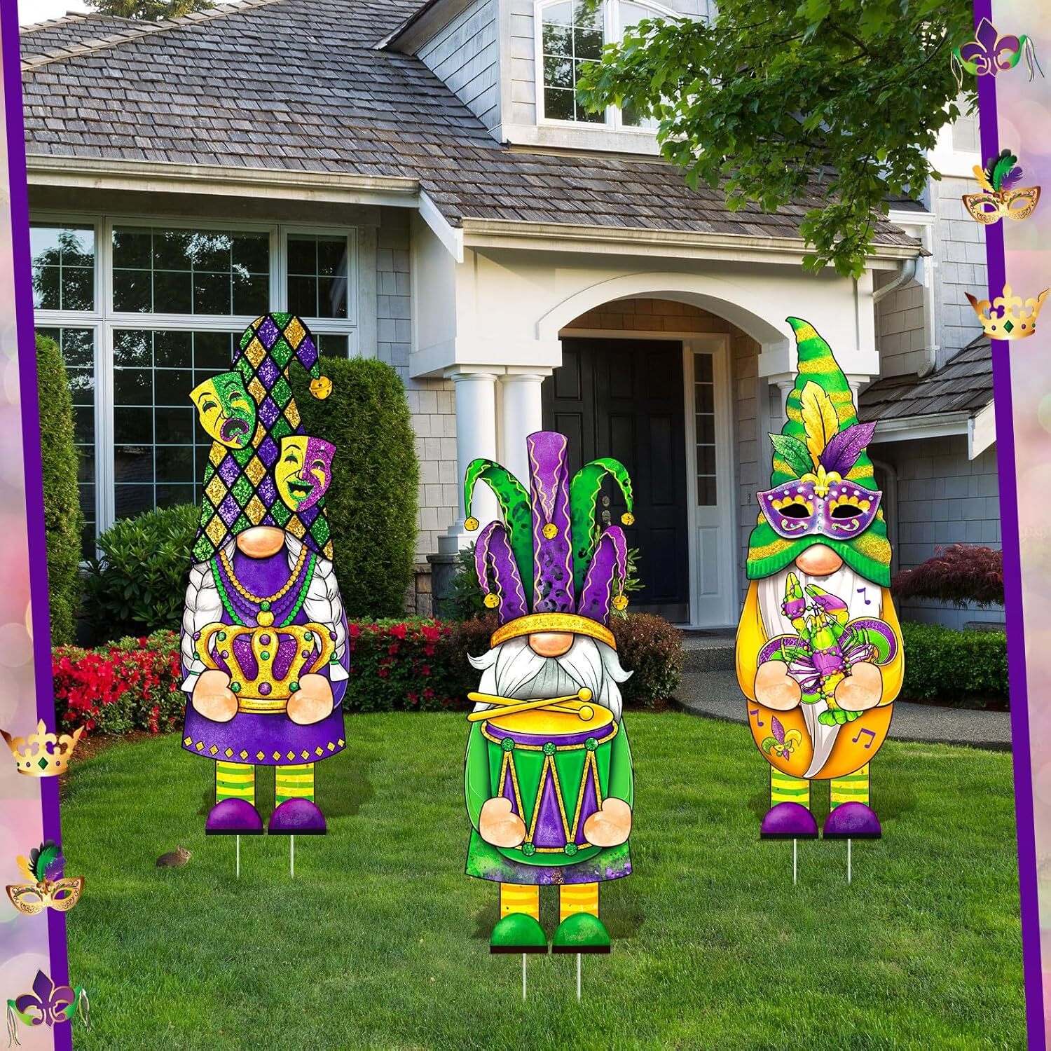 3 Pcs Mardi Gras Yard Sign Gnome Outdoor with Stakes Gold...