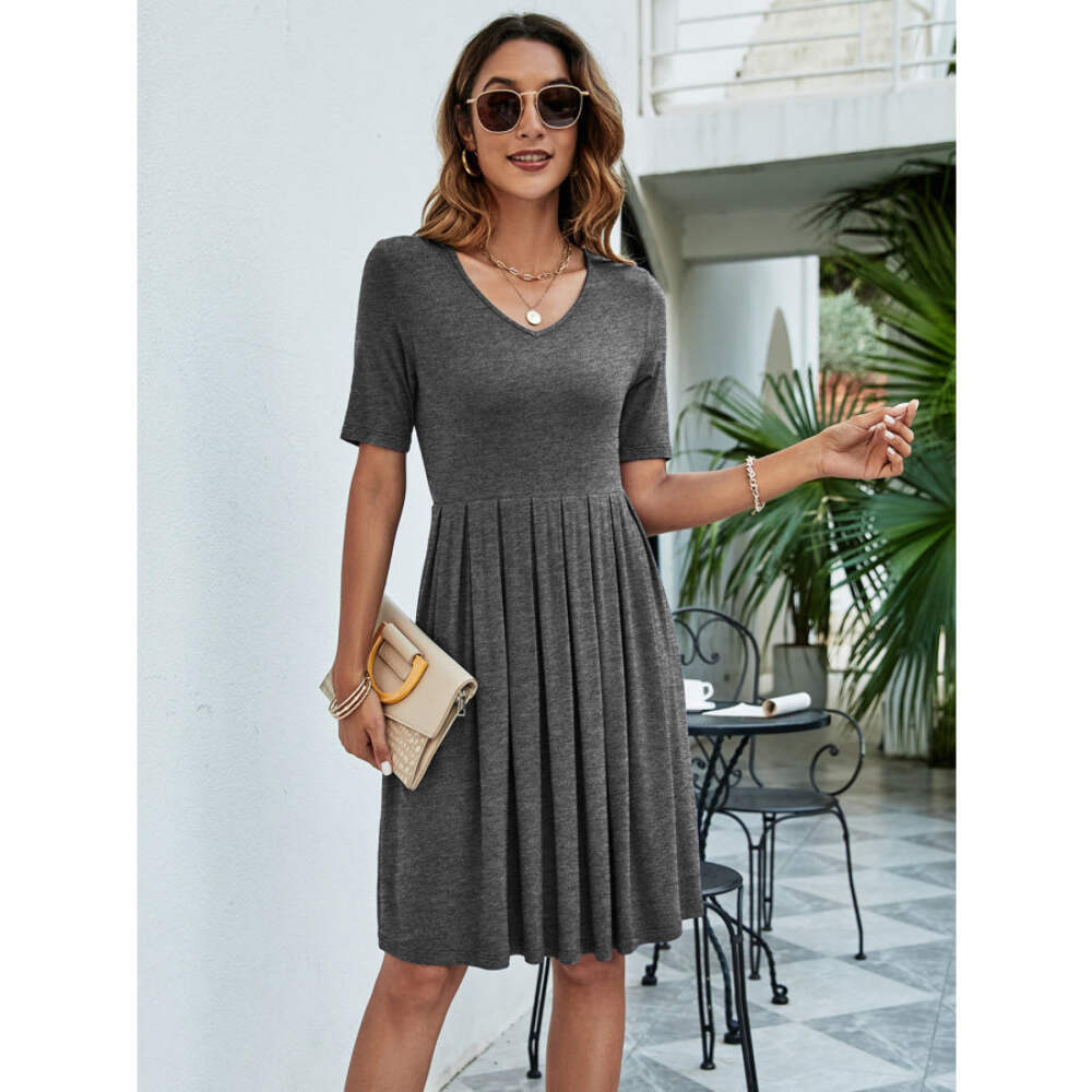 как выглядит Pleated V-Neck Short Sleeve Tee Dress фото