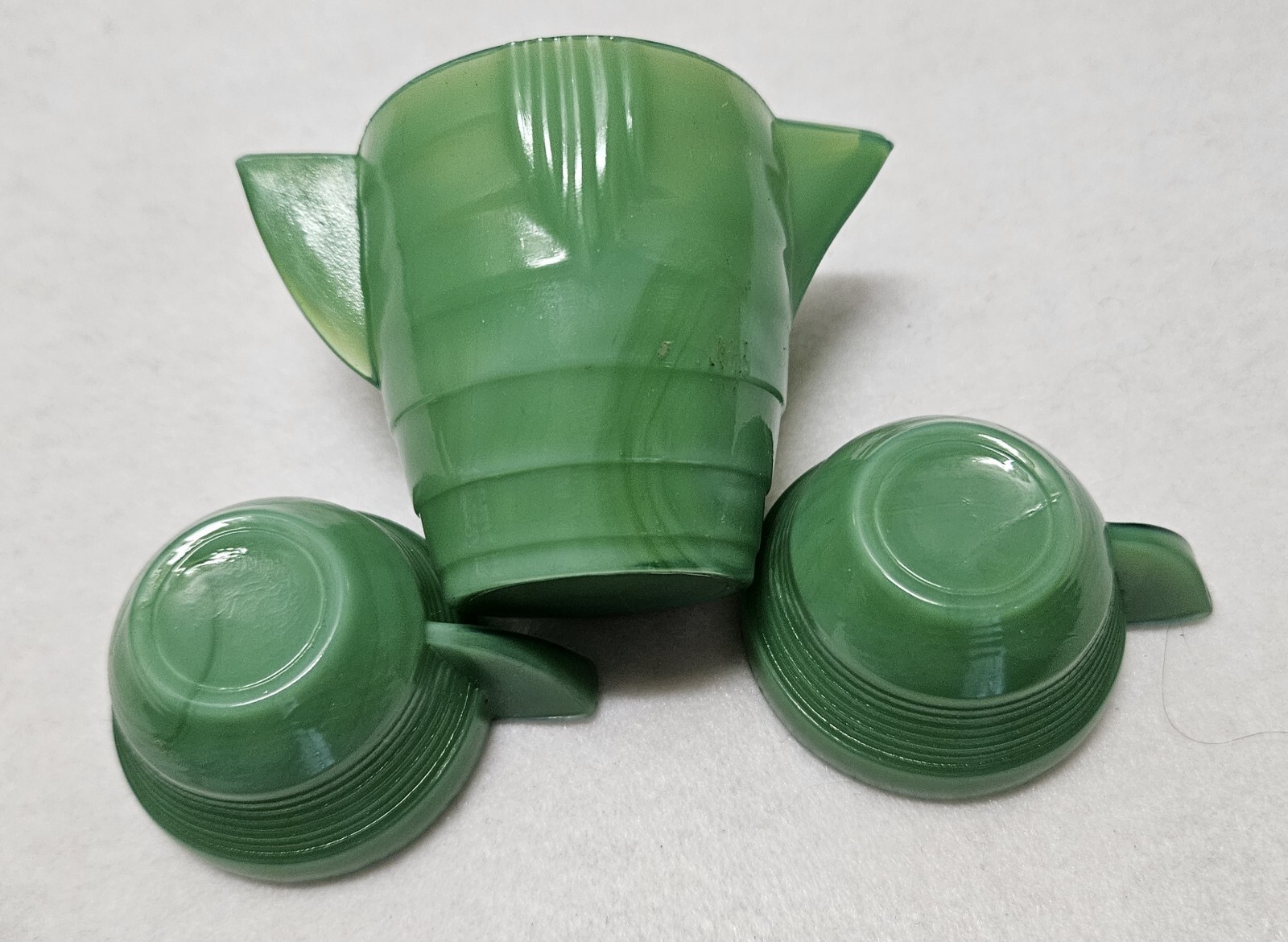 3 Akro Agate Jade Green Glass Childrens Cups Pitcher