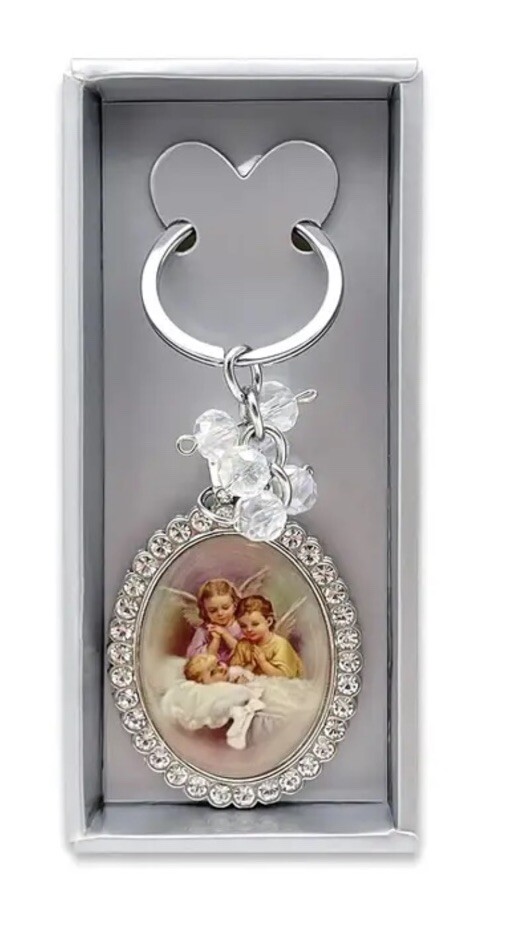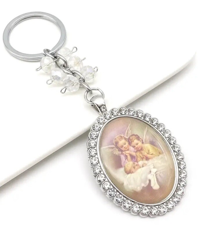 4 Silver-Tone Rhinestone Beaded Pendant Guardian Angel Keychain New Free Ship