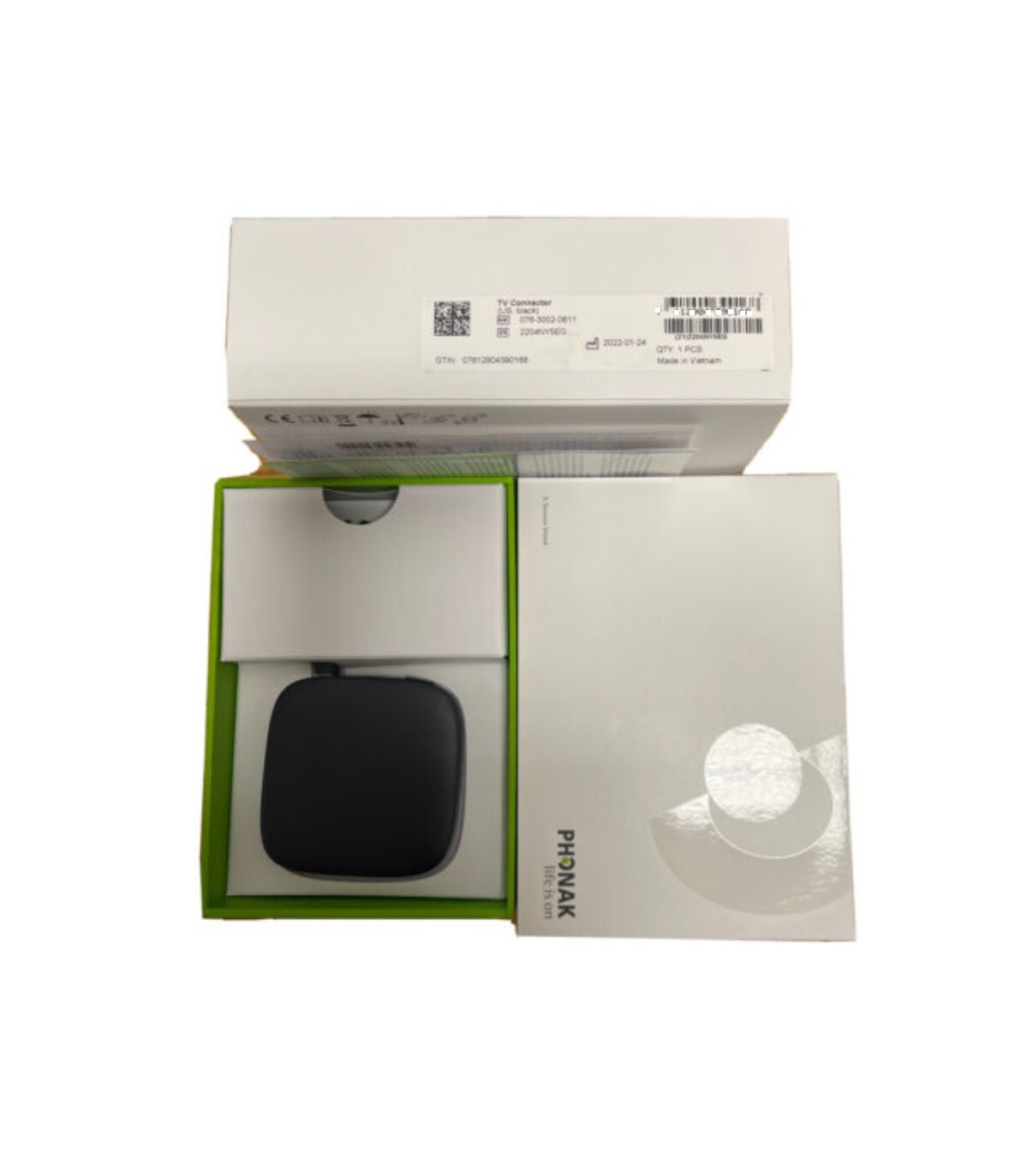New Phonak TV Connector V2 wireless accessory with all cords