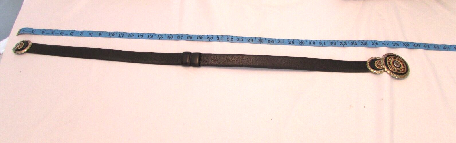как выглядит CHICOS 100 BLACK LEATHER FRONT MEDALLION HOOK BUCKLE SIZE MEDIUM 39"x1.5" BELT фото