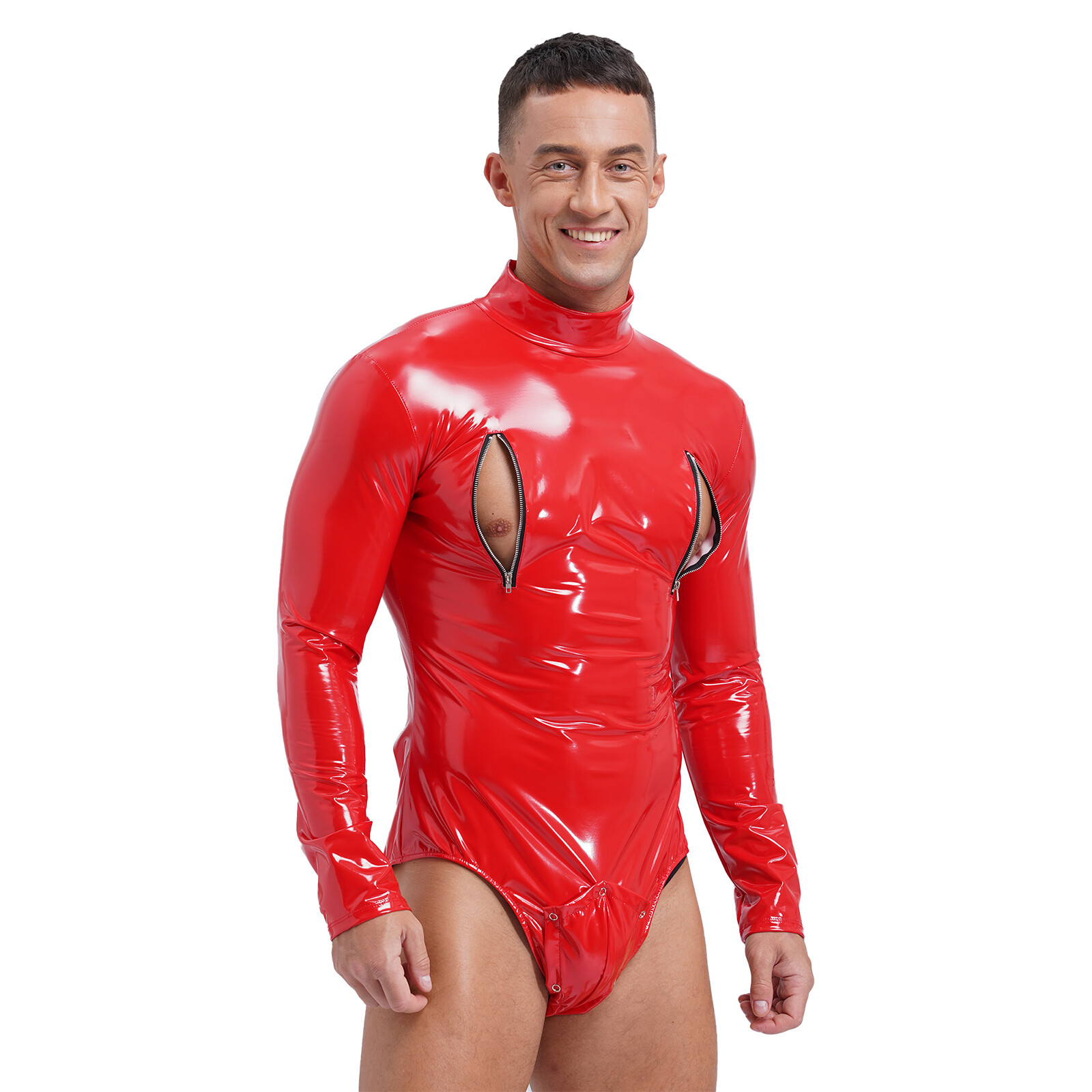 как выглядит Mens Patent Leather Bodysuit Catsuit Long Sleeve Zipper Jumpsuit Clubwear фото