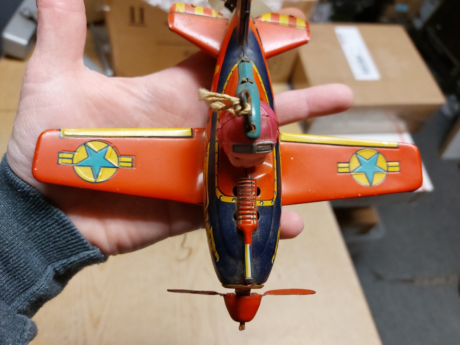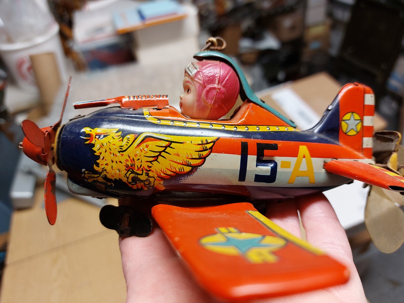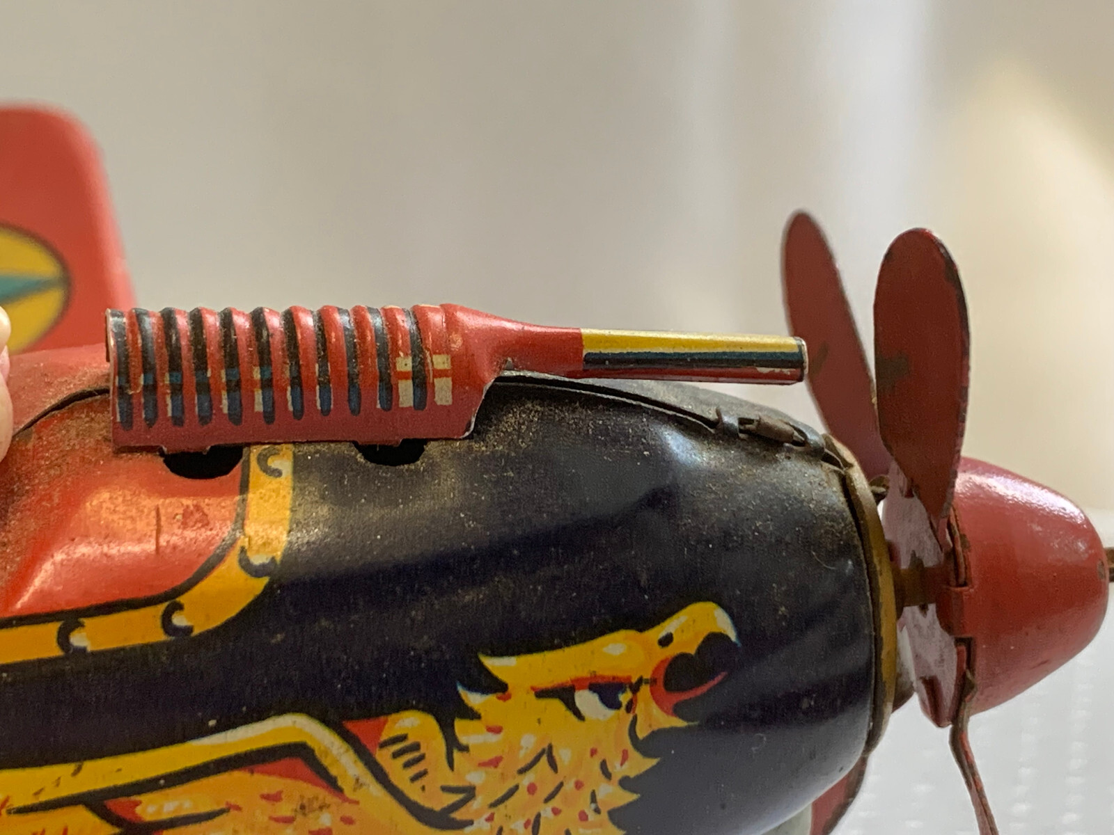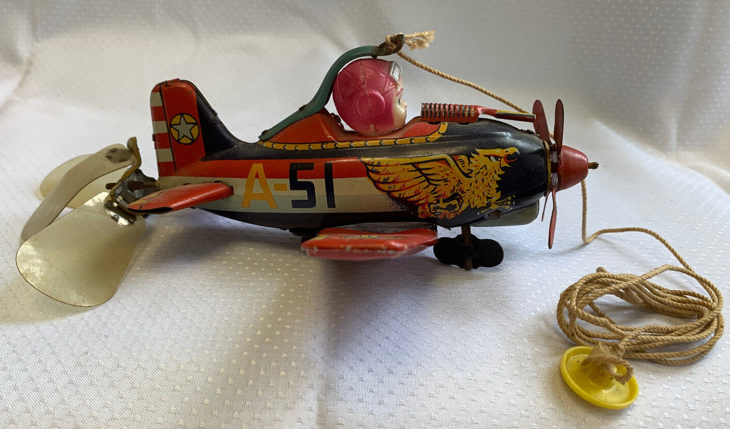 как выглядит Vtg Tin Litho Tether Plane Toy Wind Up 15-A W/ Celluloid Pilot Working Japan фото