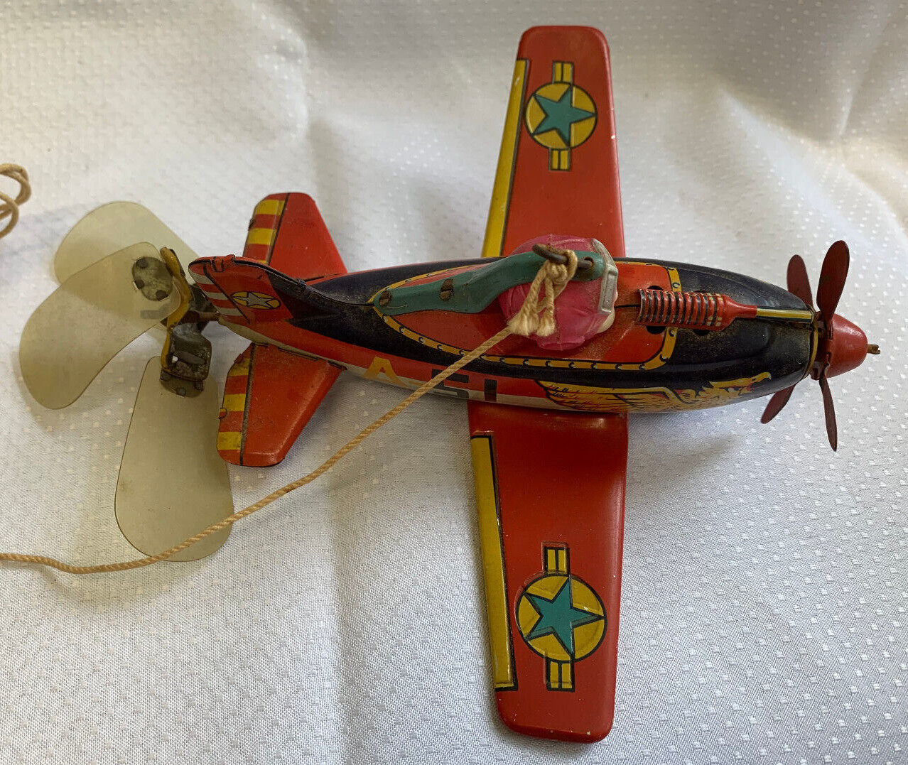 Vtg Tin Litho Tether Plane Toy Wind Up 15-A W/ Celluloid Pilot Working Japan