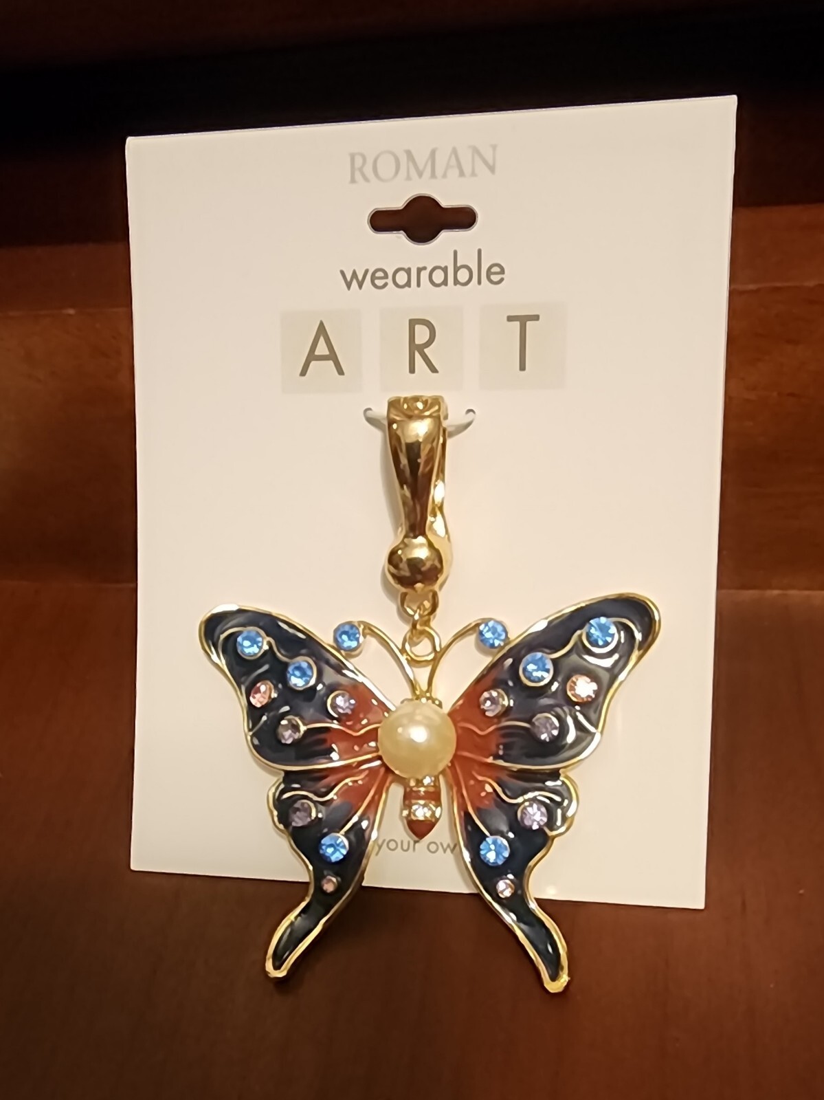 WEARABLE ART BY ROMAN NWT Gold Tone Dark Blue Statement Butterfly Womens Pendant
