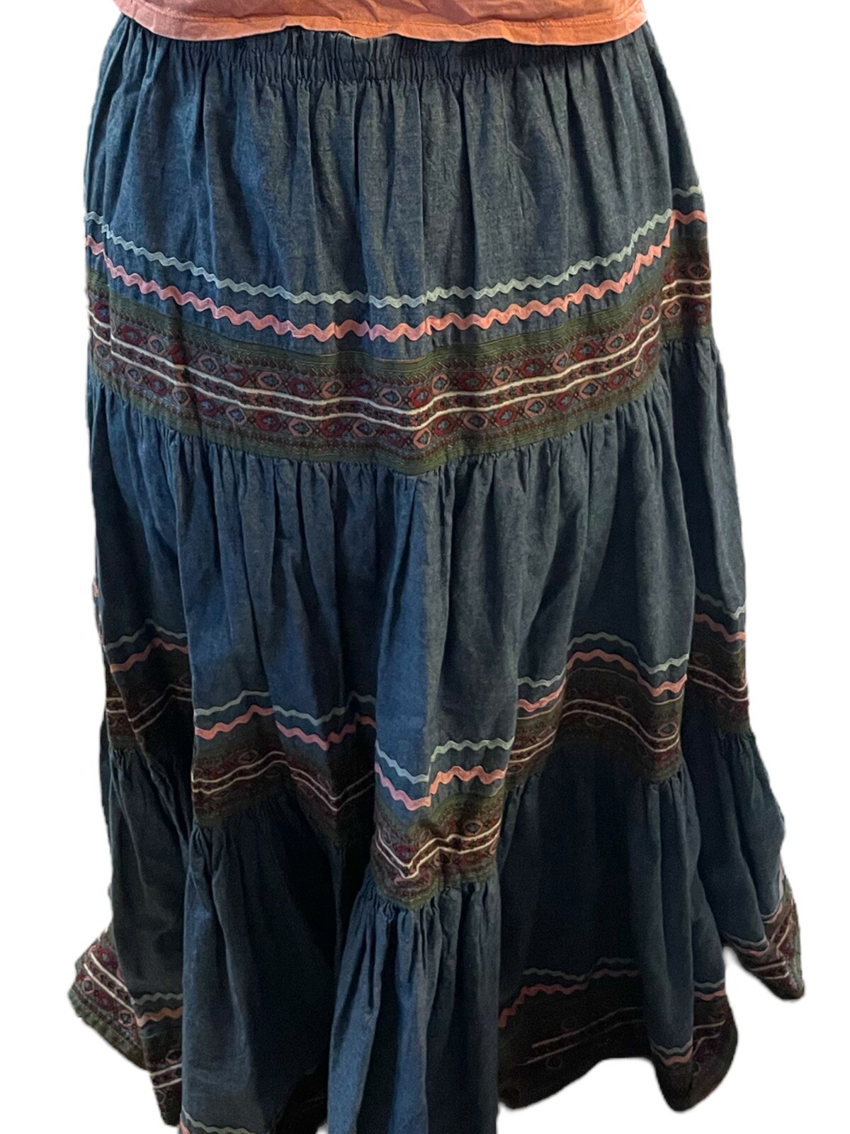 1980s VINTAGE light denim maxi bo ho skirt M ric rac hippie western farm