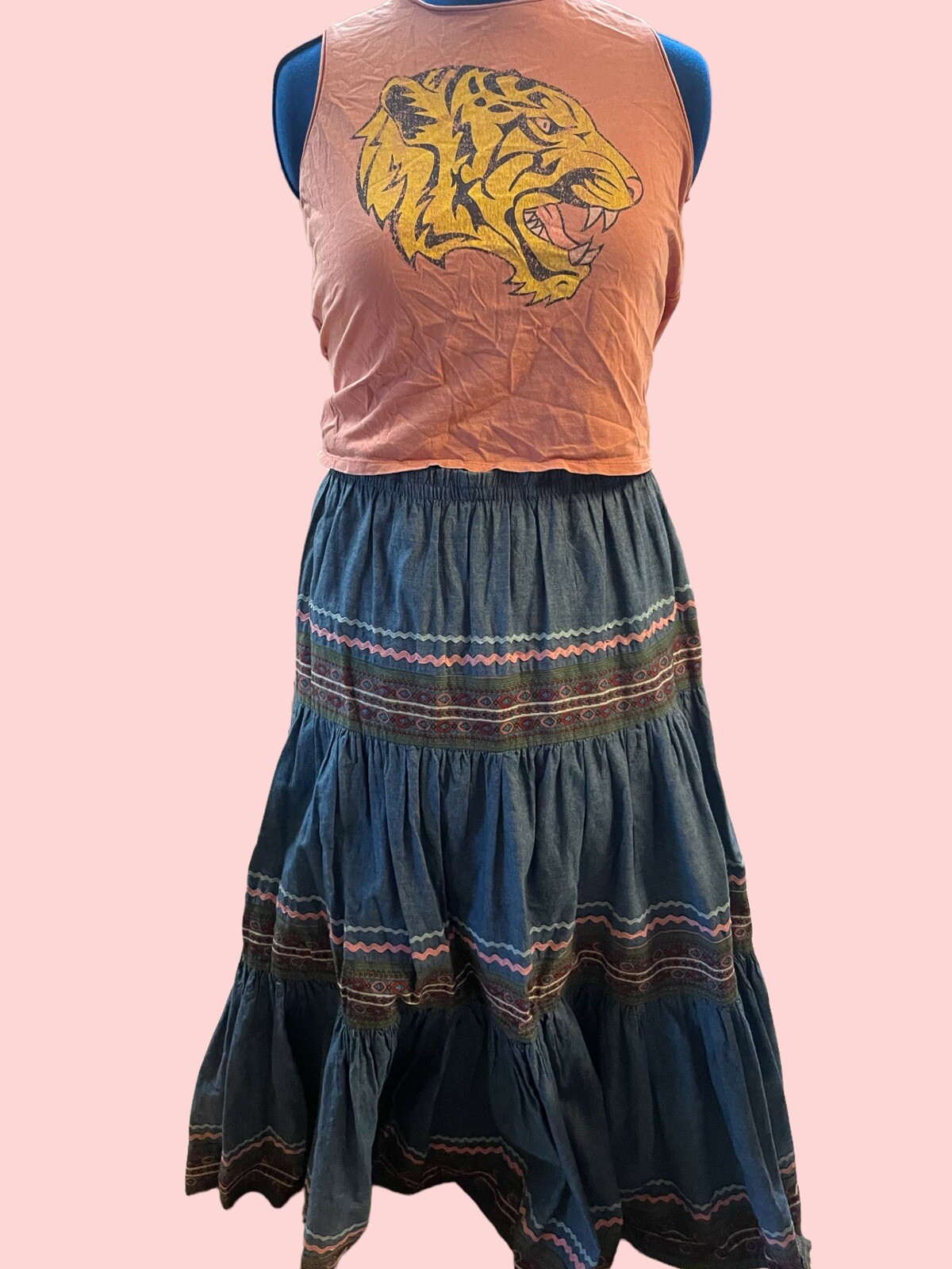 как выглядит 1980s VINTAGE light denim maxi bo ho skirt M ric rac hippie western farm фото