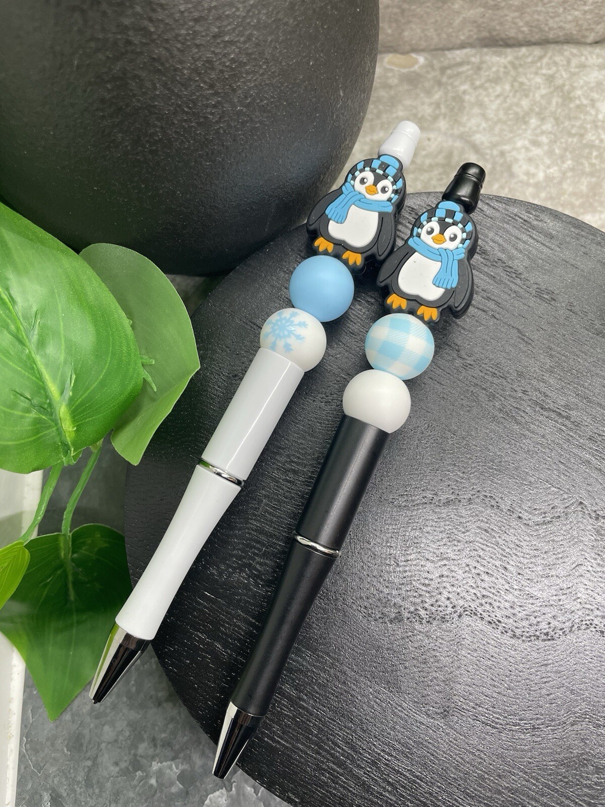 2 PC Handmade Silicone Bead Black Ink Pen Set Winter Penguin B3444