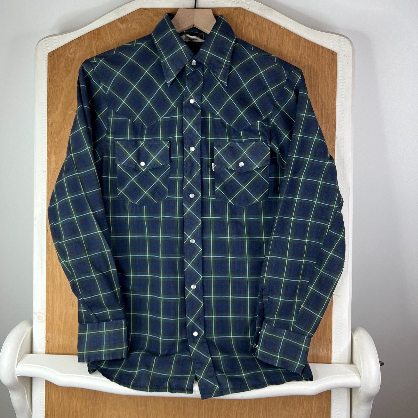 VINTAGE Levis Shirt Mens Medium Plaid Pearl Snap Western Big E Paper Thin 70s