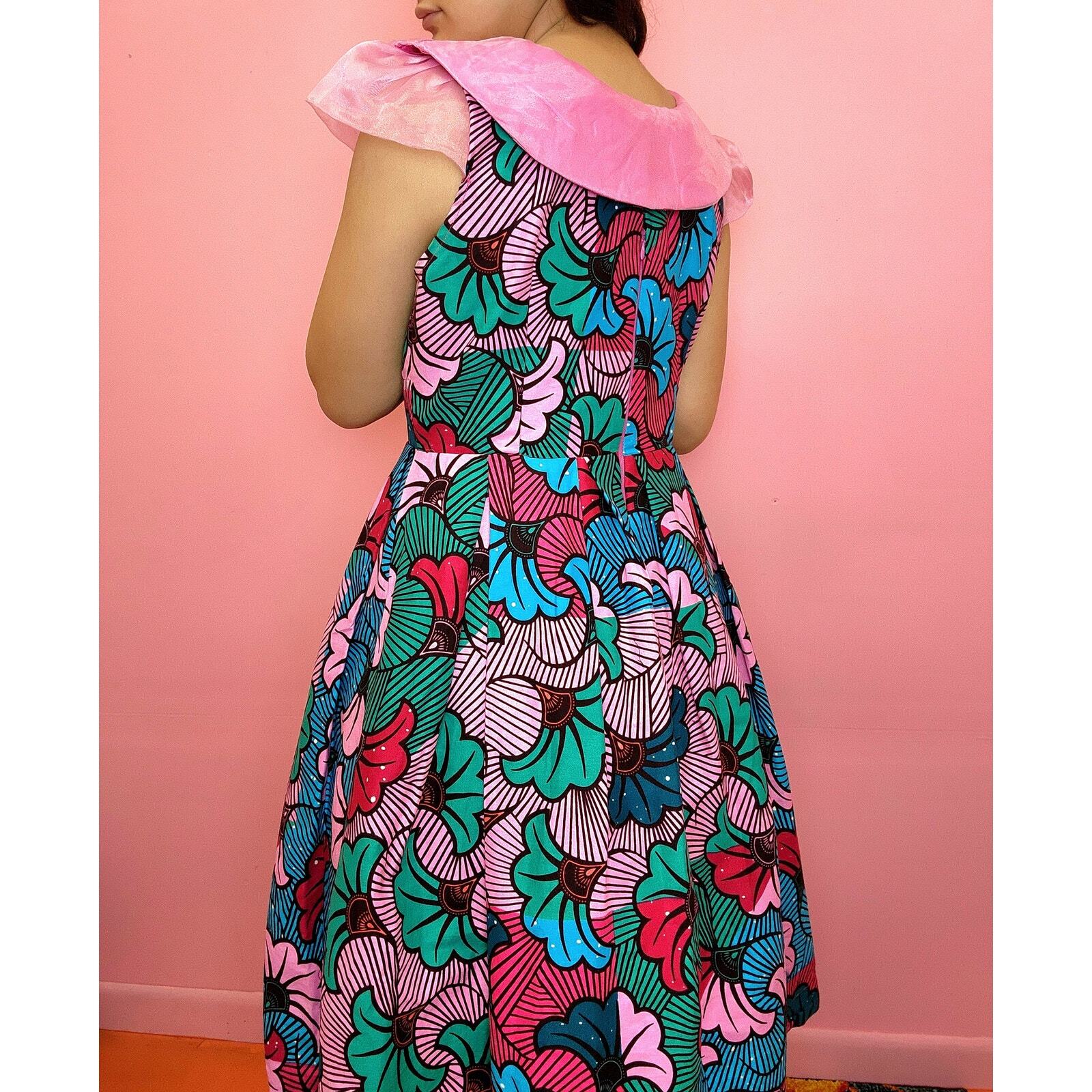 Retro Handmade African Wax Print Pink and Blue Bubble Fit Flare Dress