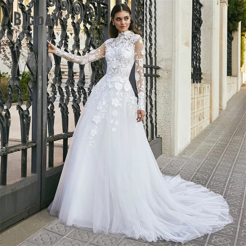A-Line Wedding Dresses Lace Illusion Back Long Sleeve High Collar Bridal Gown