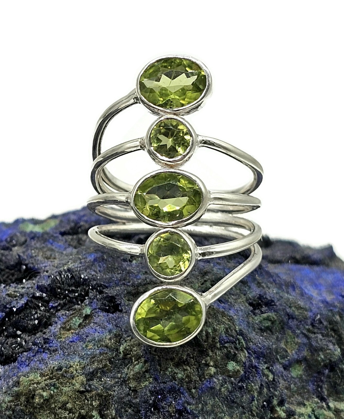 Five Stone Peridot Ring, Size 8.5, Sterling Silver, August Birthstone, Statement