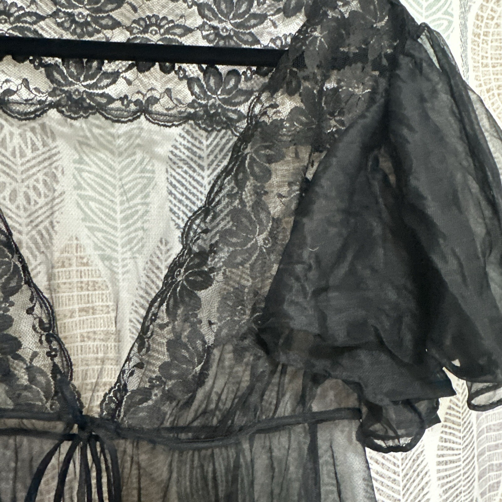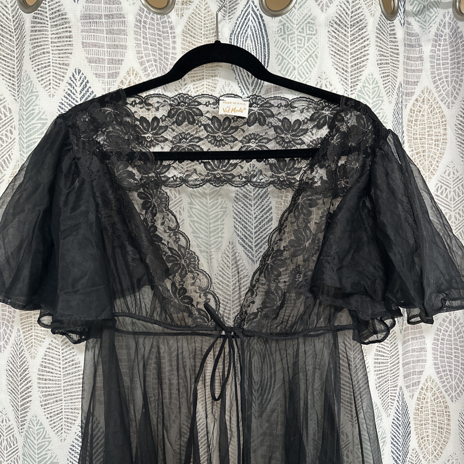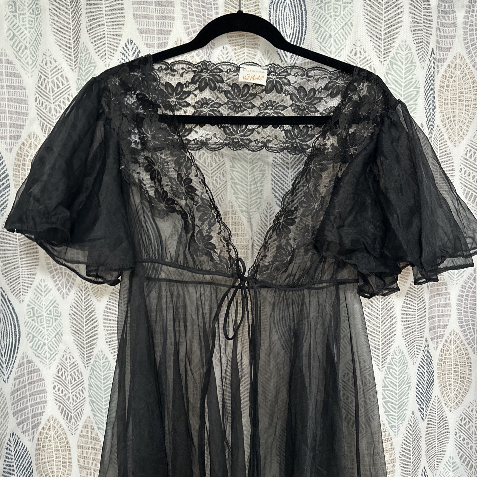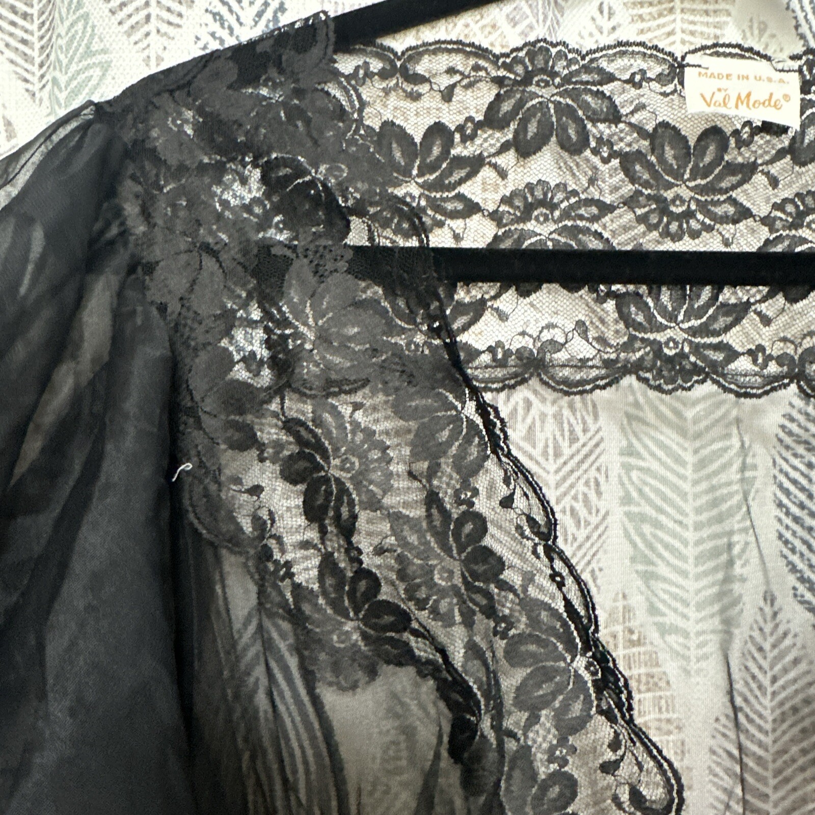 Vintage VAL MODE Peignoir Black Nylon Sz L Negligee Robe 60s 70s