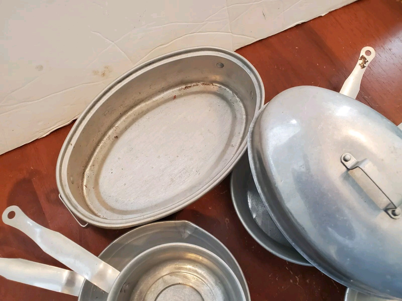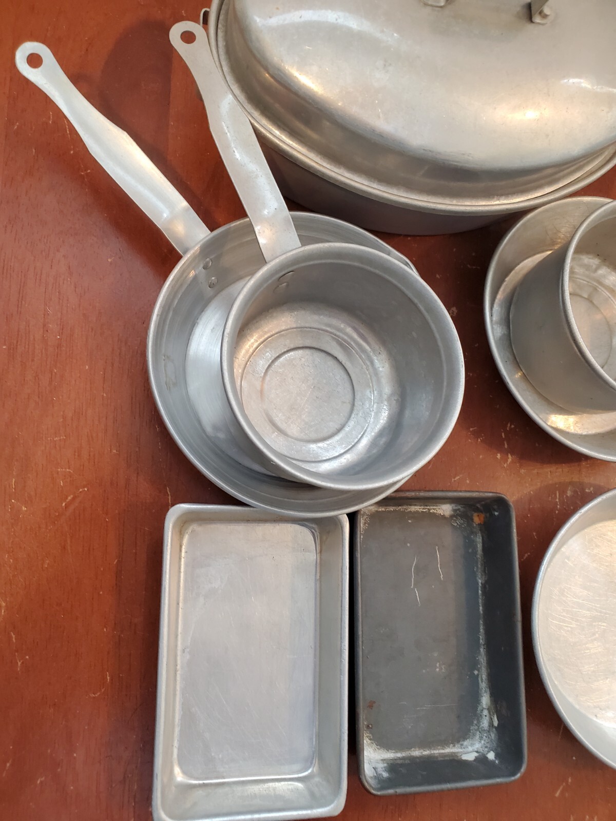 как выглядит 9 piece group of vintage aluminum doll dishes childs play toys, pots, pans bake фото