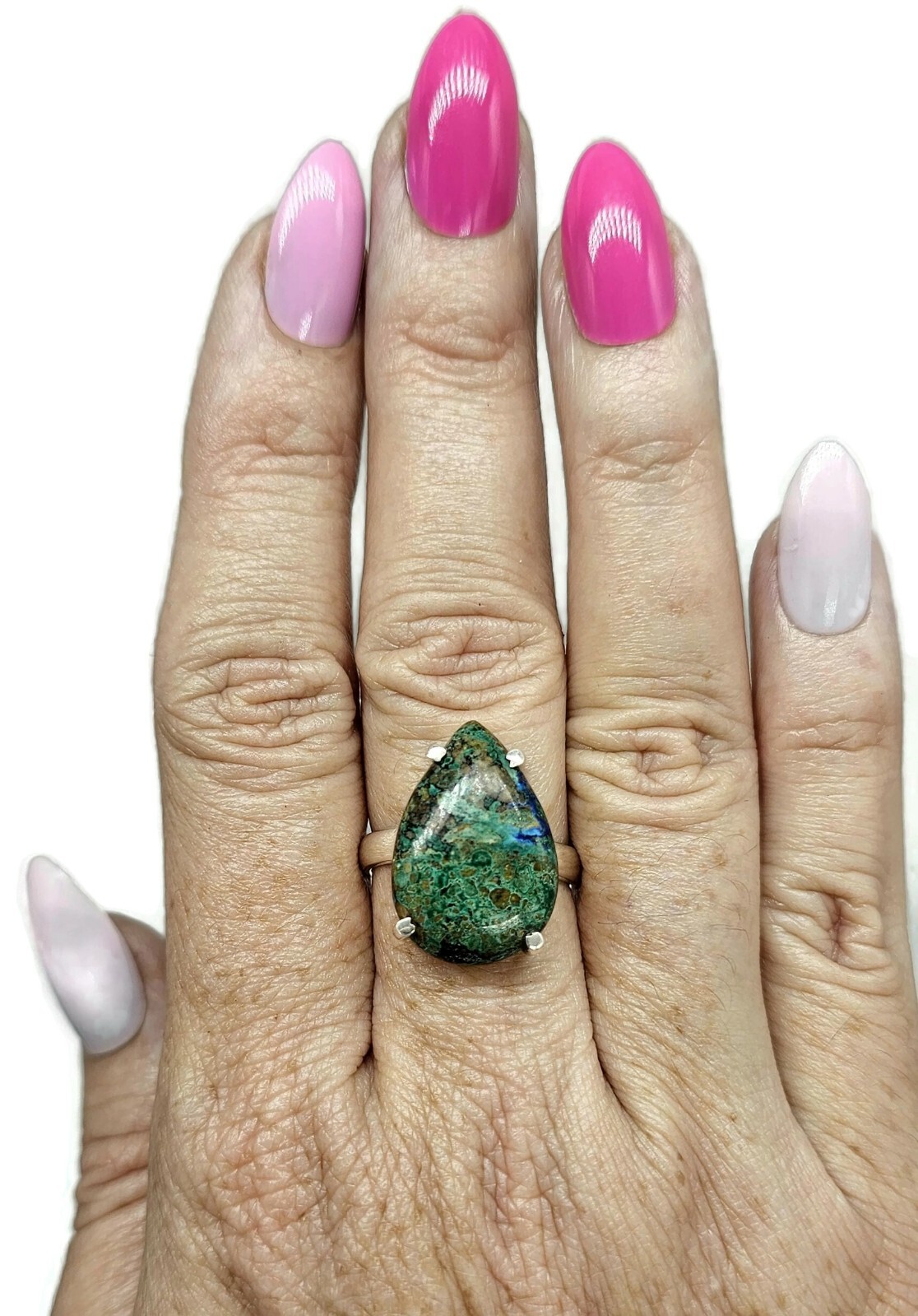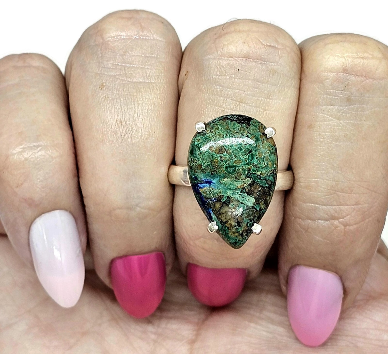 как выглядит Azurite Malachite Ring, Size S, Sterling Silver, Pear Shaped, Green Blue Gem фото
