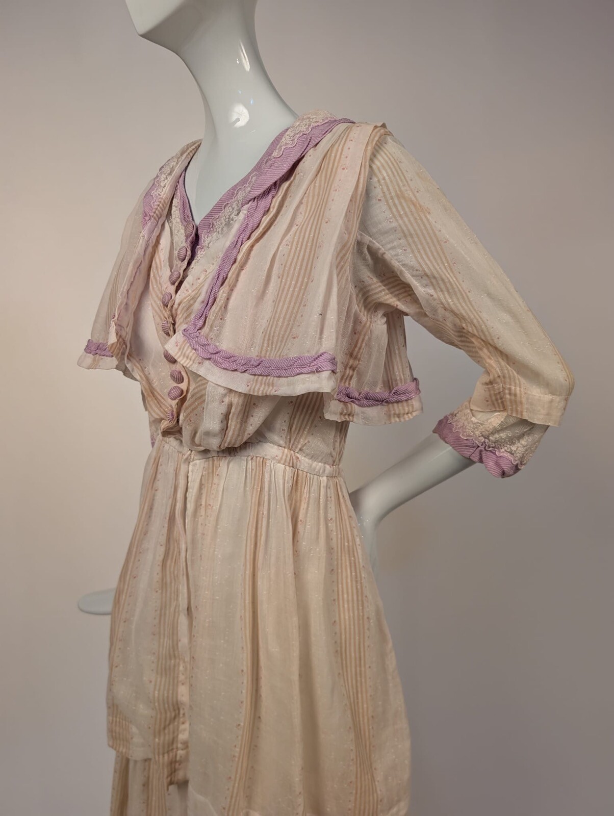 EDWARDIAN STRIPED MUSLIN DRESS W LAVENDER SILK EDGING TRIPLE TIERED SKIRT