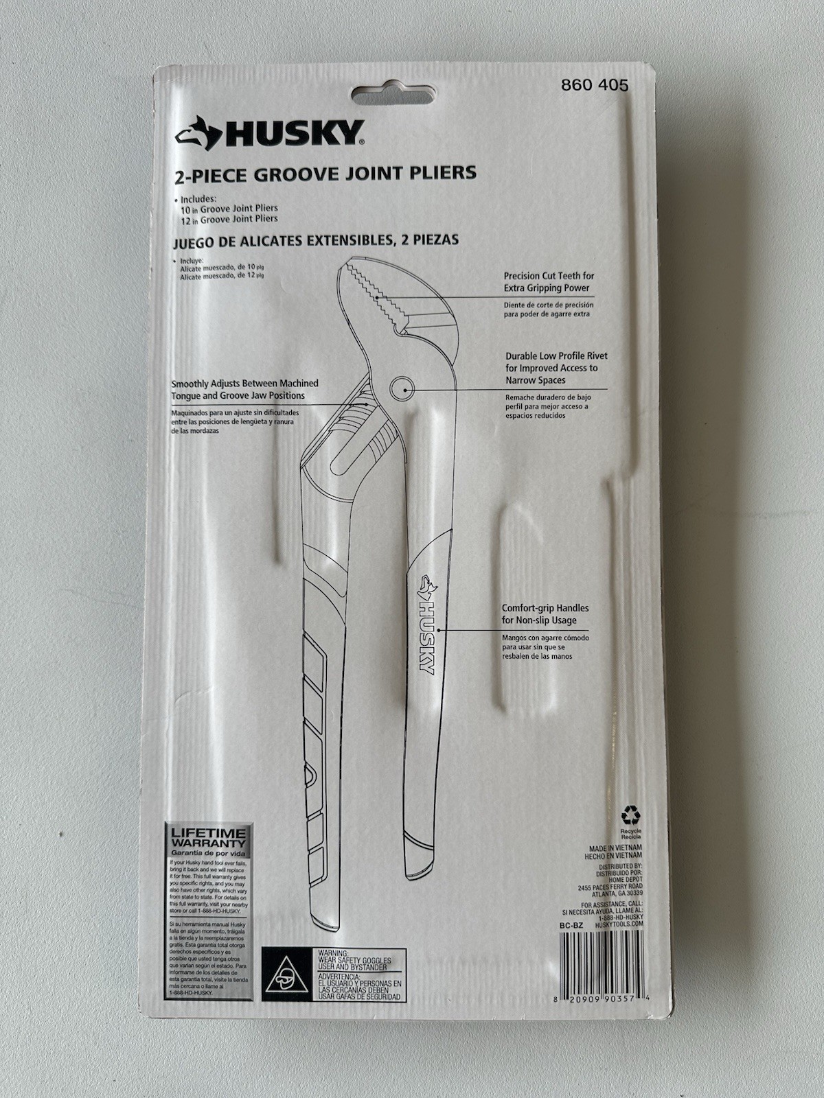 Husky Groove Joint Pliers 2 Piece Set 10 and 12 Inch Hand Tool Straight Jaw NIP