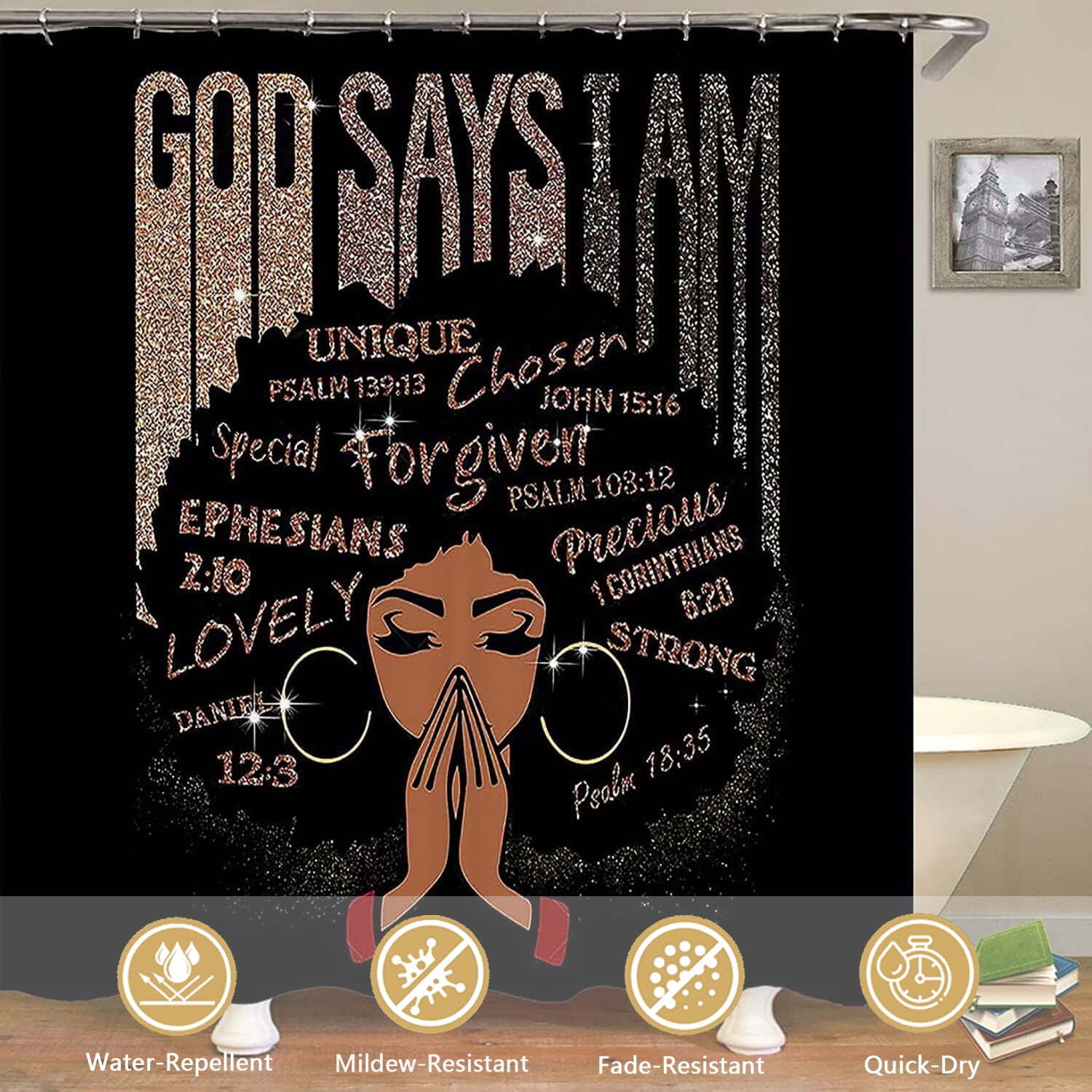 FRAMICS Black Girl Glitter Shower Curtain Set 16-Piece Waterproof Bathroom Set